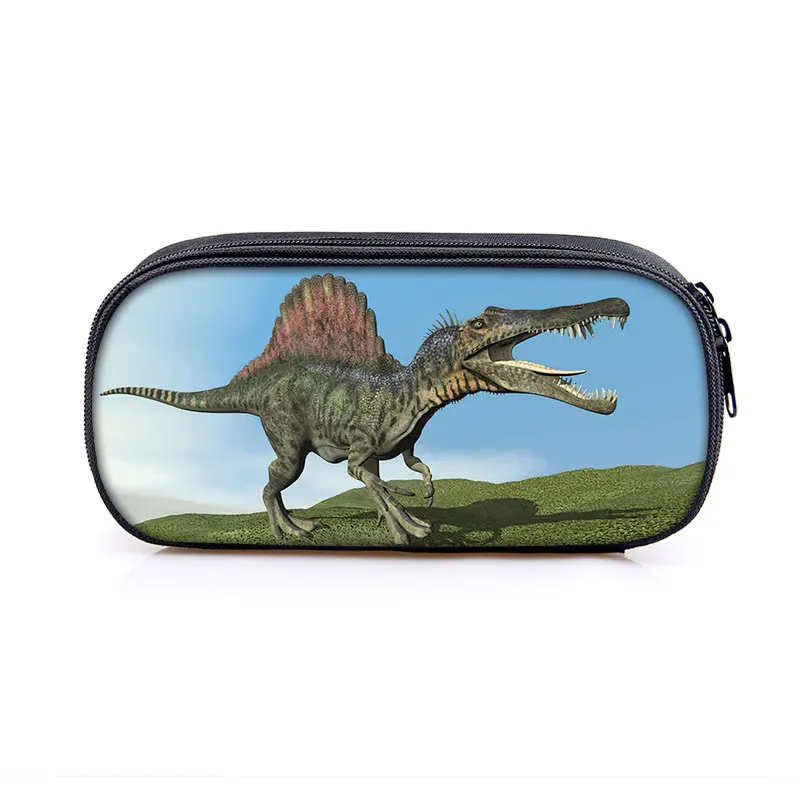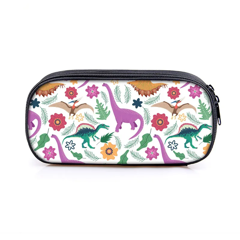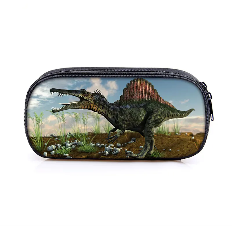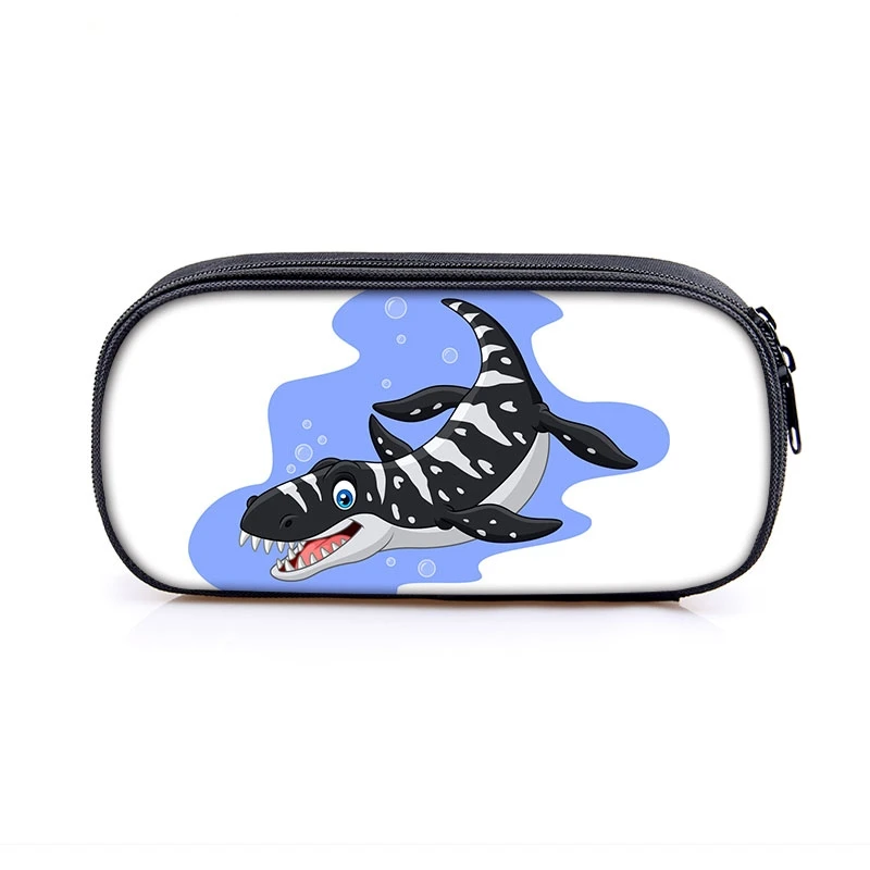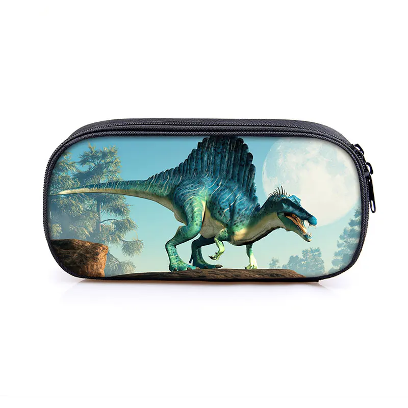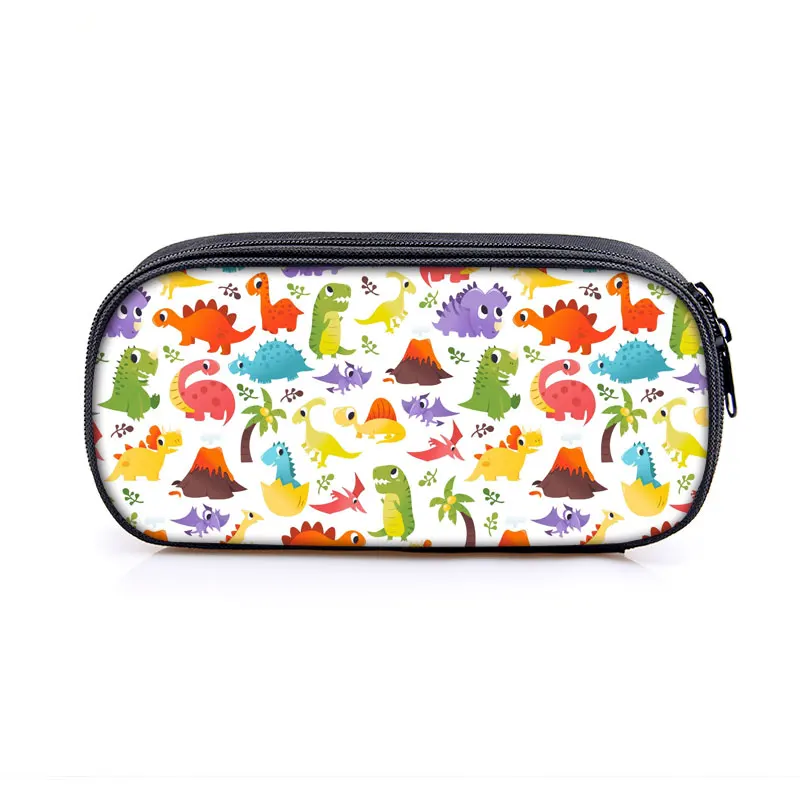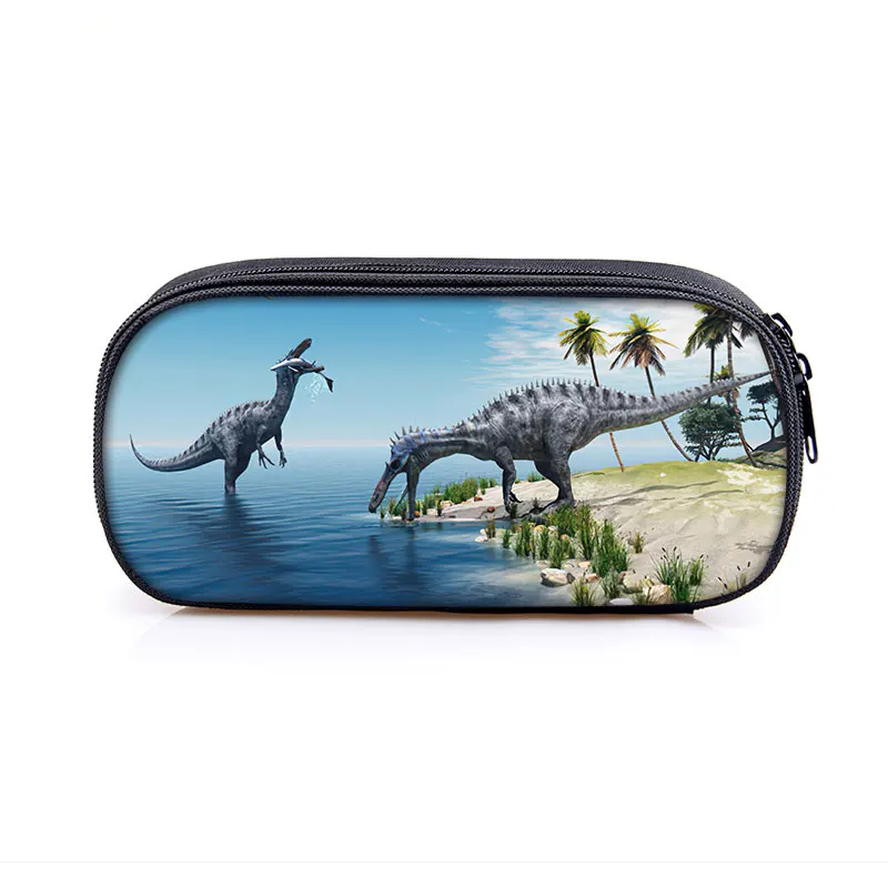 The playful dinosaur-themed cosmetic case, model number 23071801, features a vibrant, box-shaped design. Measuring 20 cm in length, 10 cm in height, and 5 cm in width, it is crafted from durable polyester with a smooth, glossy finish. The eye-catching exterior displays a detailed Tyrannosaurus rex against a dramatic backdrop, while whimsical flying dinosaurs add charm to the design. The zipper closure ensures easy access to the organized interior, complete with compartments for brushes and small items. Weighing only 80 g, this casual case is perfect for dinosaur enthusiasts looking to keep their essentials stylishly organized.