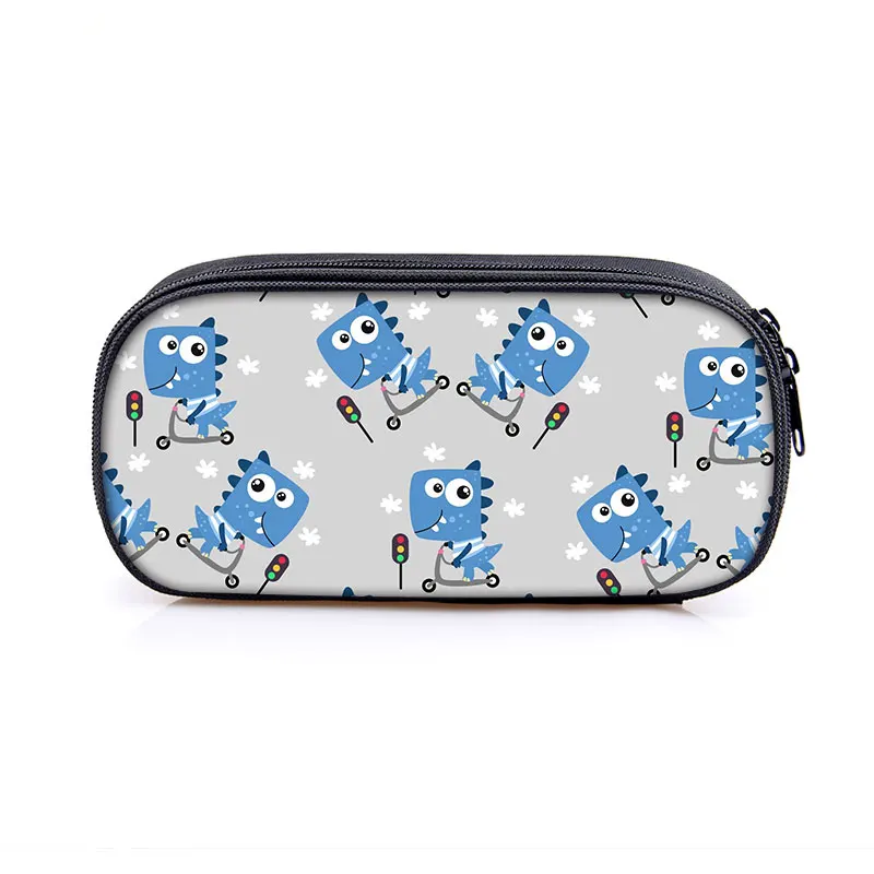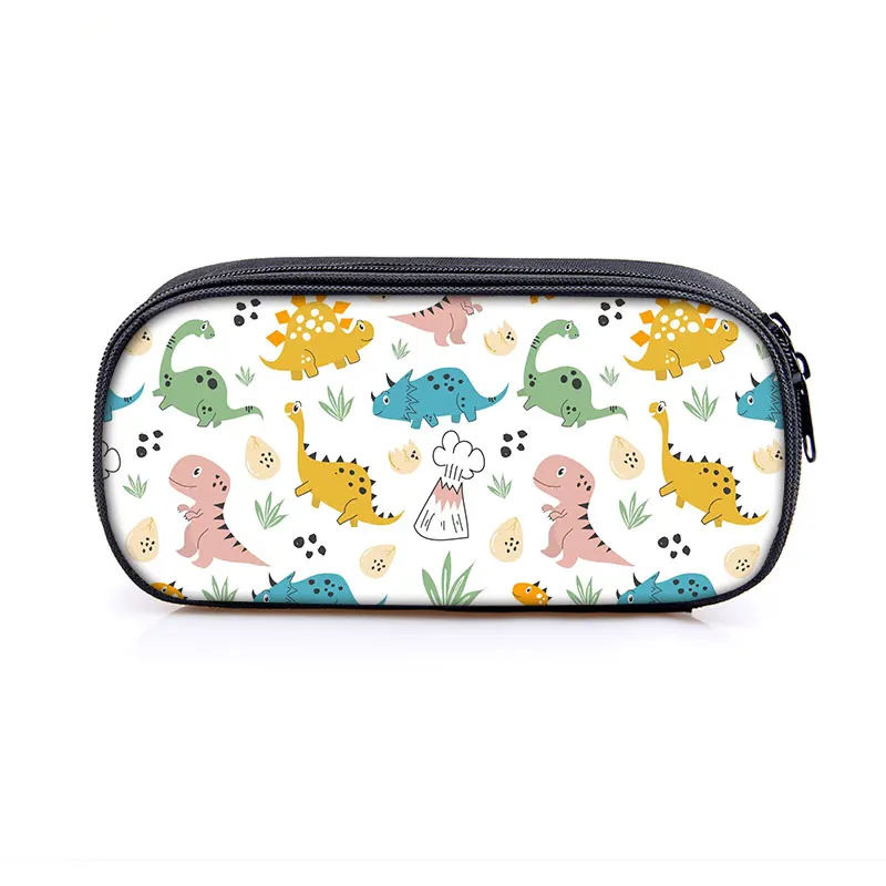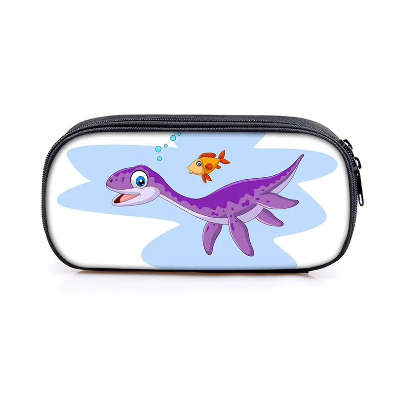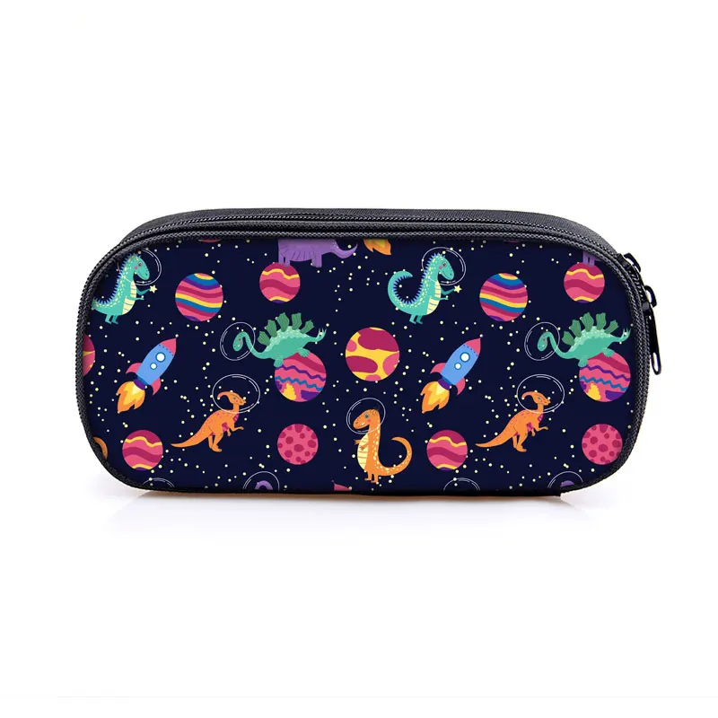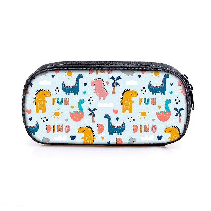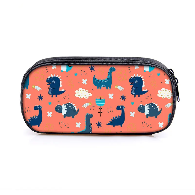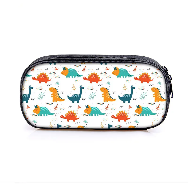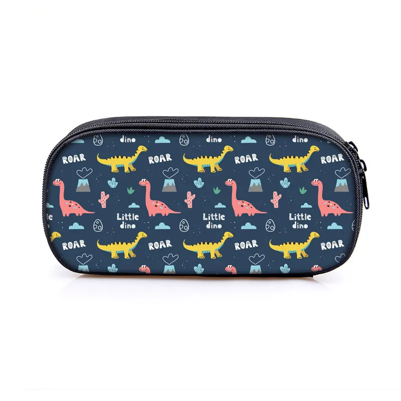 The playful dinosaur-themed cosmetic case, model number 23071801, features a vibrant, box-shaped design. Measuring 20 cm in length, 10 cm in height, and 5 cm in width, it is crafted from durable polyester with a smooth, glossy finish. The eye-catching exterior displays a detailed Tyrannosaurus rex against a dramatic backdrop, while whimsical flying dinosaurs add charm to the design. The zipper closure ensures easy access to the organized interior, complete with compartments for brushes and small items. Weighing only 80 g, this casual case is perfect for dinosaur enthusiasts looking to keep their essentials stylishly organized.