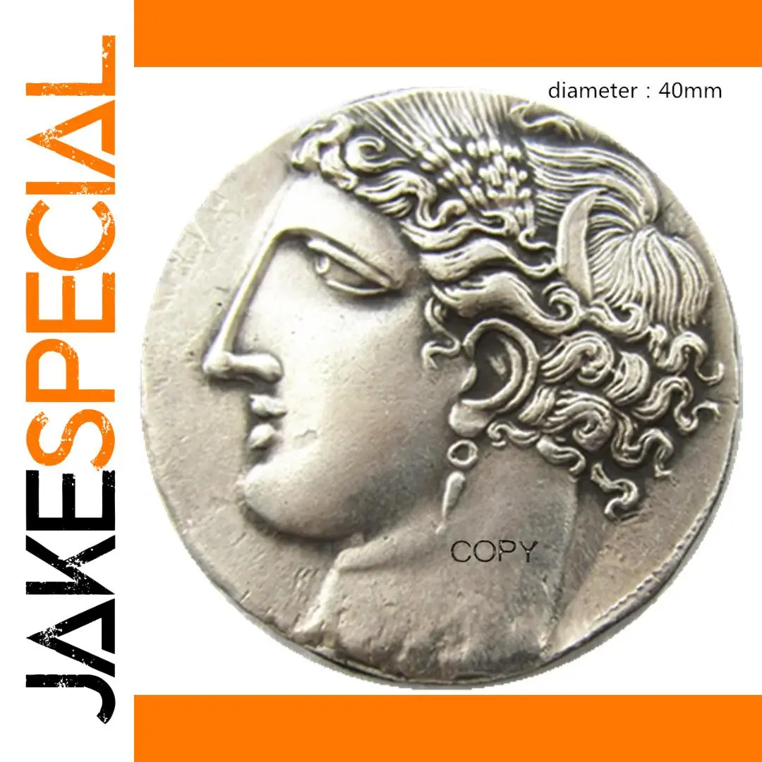 Discover this exquisite replica coin crafted with ancient Greek artistry, featuring intricate relief designs that evoke the grandeur of classical Europe. Measuring approximately 40 millimeters in diameter, this coin showcases a detailed human profile facing left, reminiscent of ancient depictions of deities or historical figures. Its elaborate, flowing curly hair, textured with fine lines, adds a sense of ornate elegance and movement. The silver-colored metal surface boasts an aged, antique finish, blending polished artistry with vintage charm. This nostalgic piece embodies patriotism, highlighting European heritage from around 1840 or earlier. Whether for collection or display, it offers a tangible connection to ancient craftsmanship and history, perfect for antique enthusiasts seeking a refined, historical aesthetic.
