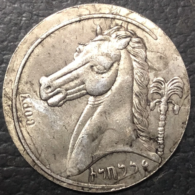 Imagine holding in your hands a finely crafted piece that transports you back to 320 BC in Sicily. This authentic replica features a circular surface with a silver-like finish, showcasing complex designs that evoke the artistry of ancient civilizations. Its vintage appearance is enhanced by carefully applied wear and patina, giving it an authentic aged look. The embossed horse's head facing left, with flowing textured mane and detailed facial features, reveals meticulous craftsmanship. Adjacent, a stylized palm tree with a curved trunk and detailed fronds adds to the piece's artistic appeal. Perfectly balanced and symmetrical, this collectible artifact combines historical symbolism with decorative elegance, making it a standout addition to any collection or display space that celebrates ancient artistry and timeless craftsmanship.