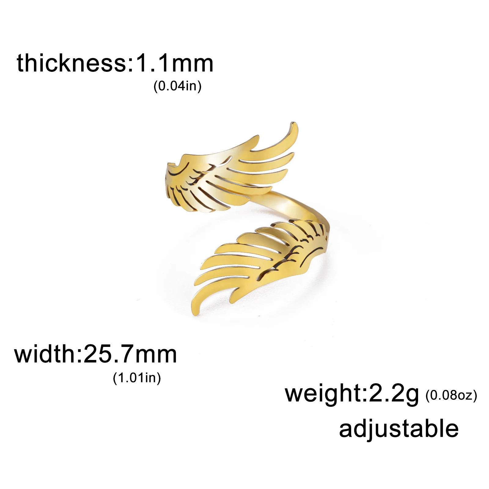 - Technical specifications include: high-quality stainless steel base, 18k gold plating, adjustable open design, feather wing pattern, and durable polished finish.