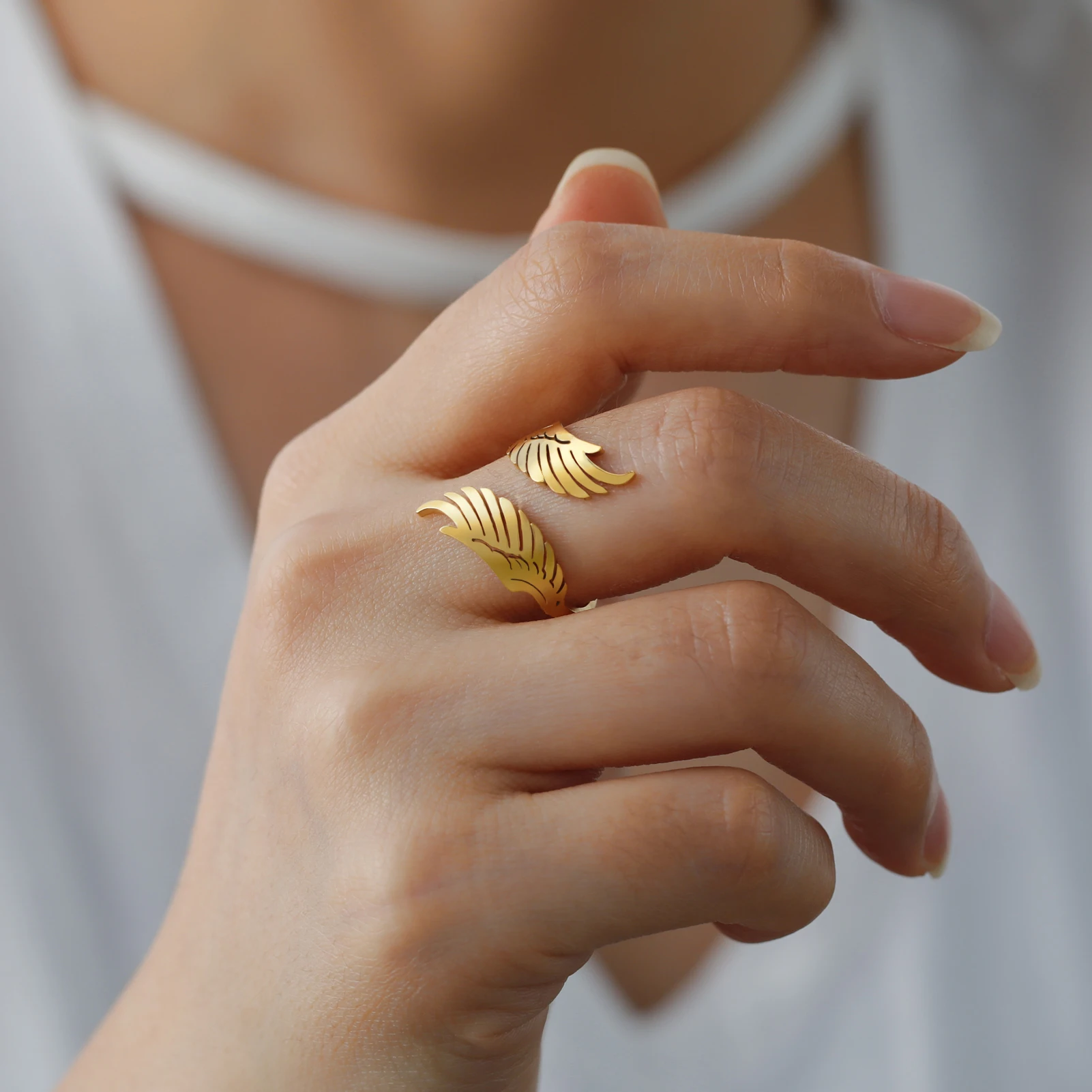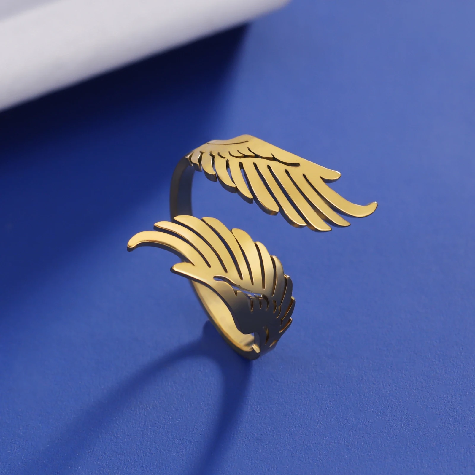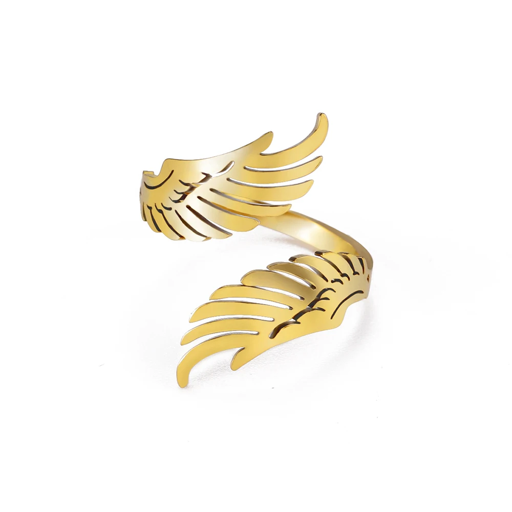Experience the beauty and grace of this stunning angel wing ring, designed to elevate your daily or special occasion look. Crafted from high-quality stainless steel and plated with 18k gold, this open-ended, adjustable ring offers luxurious style with modern resilience. The delicate feathered wings extend outward in a dynamic, three-dimensional pattern, symbolizing freedom and grace. Available in two elegant shades – shiny gold and sleek silver – it complements any outfit, from casual to formal. Its durable, rust-resistant surface ensures long-lasting beauty, whether you're celebrating a birthday, wedding, or simply adding a touch of trendy flair to your everyday wardrobe. Comfortable and versatile, this ring truly reflects your unique style and personality.