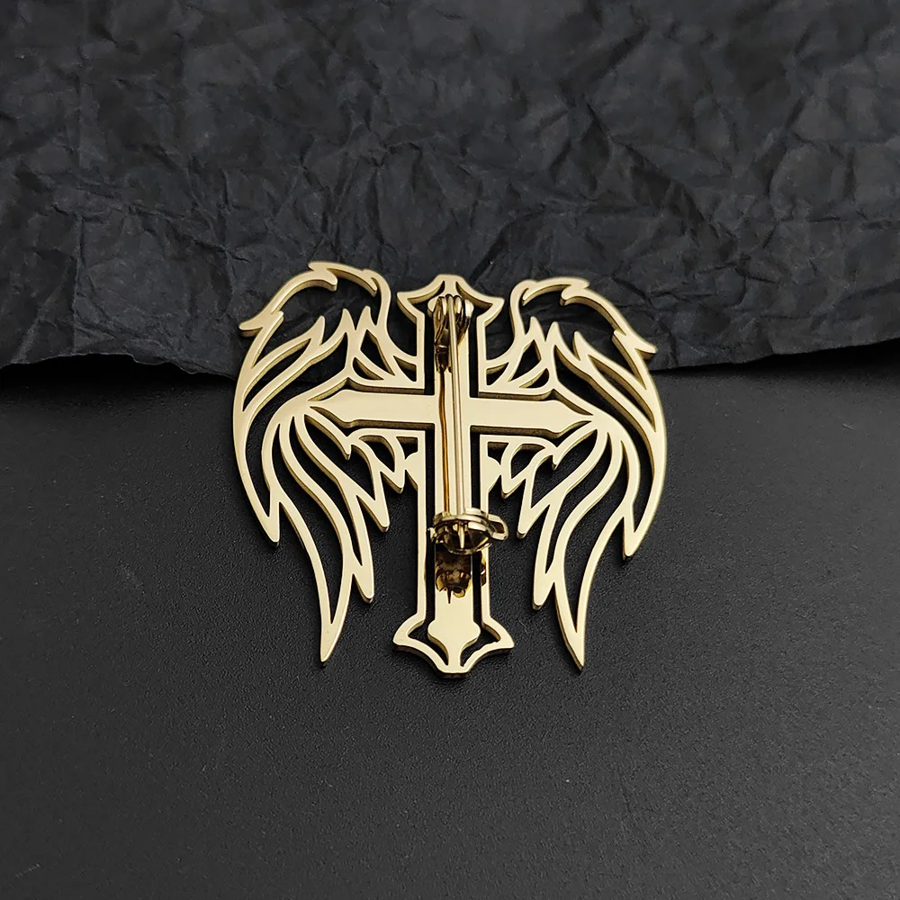 - This pin features a vintage-inspired design, with ornate, pointed cross tips and symmetrical hollow-out wings, blending gothic, punk, and trendy fashion elements seamlessly.