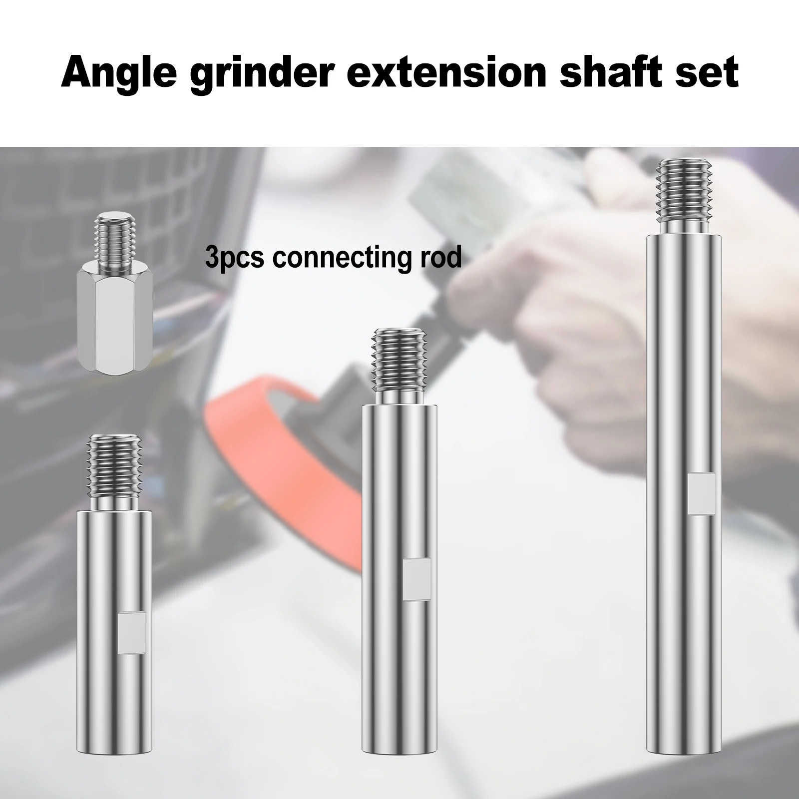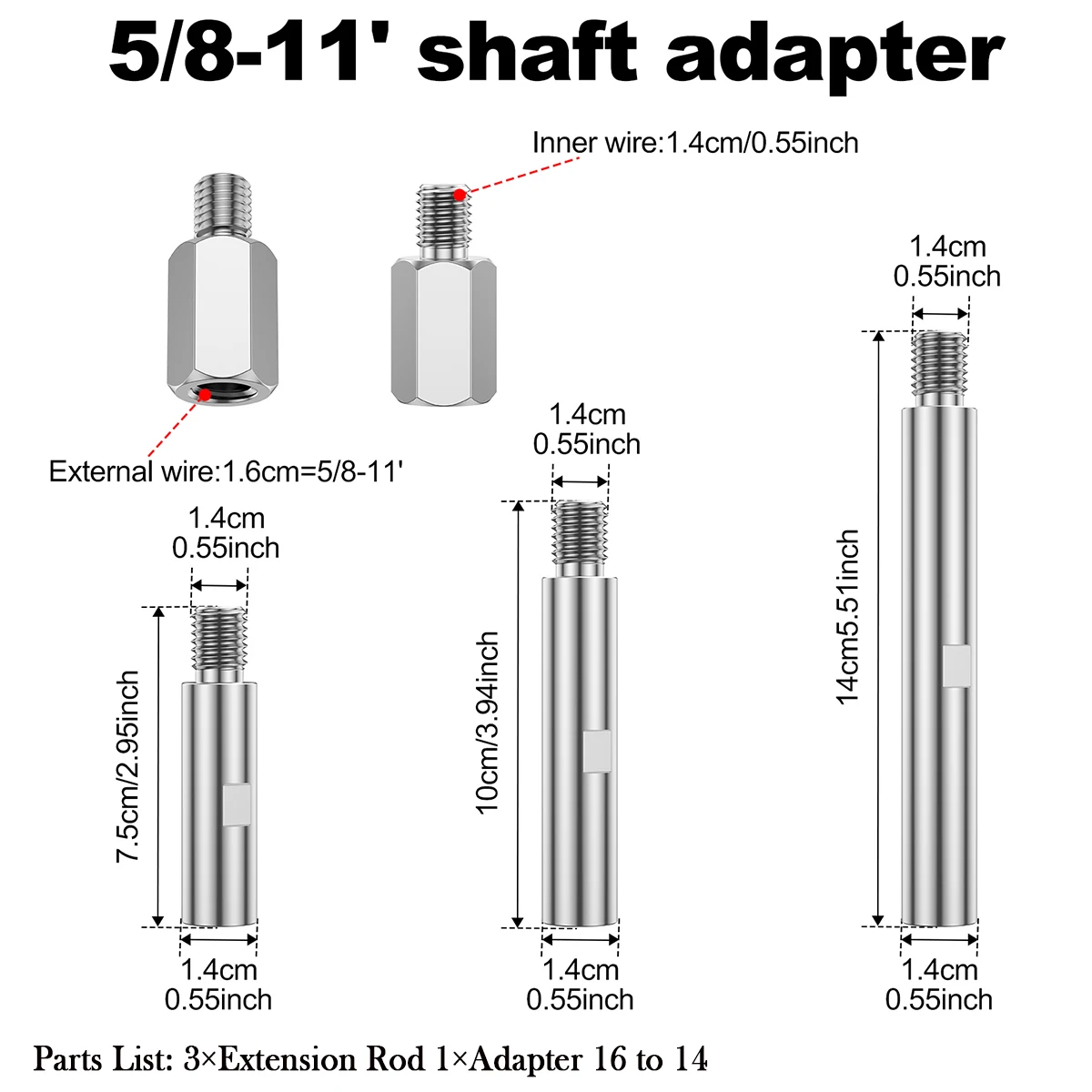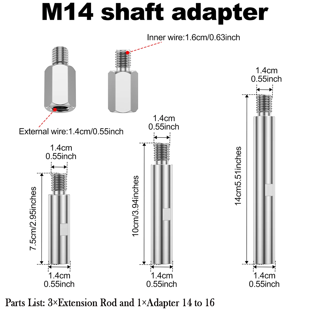- The three steel extension rods measure 7.5 cm, 10 cm, and 14 cm long with a 14mm diameter, perfect for reaching inaccessible or tight areas during grinding or polishing tasks.