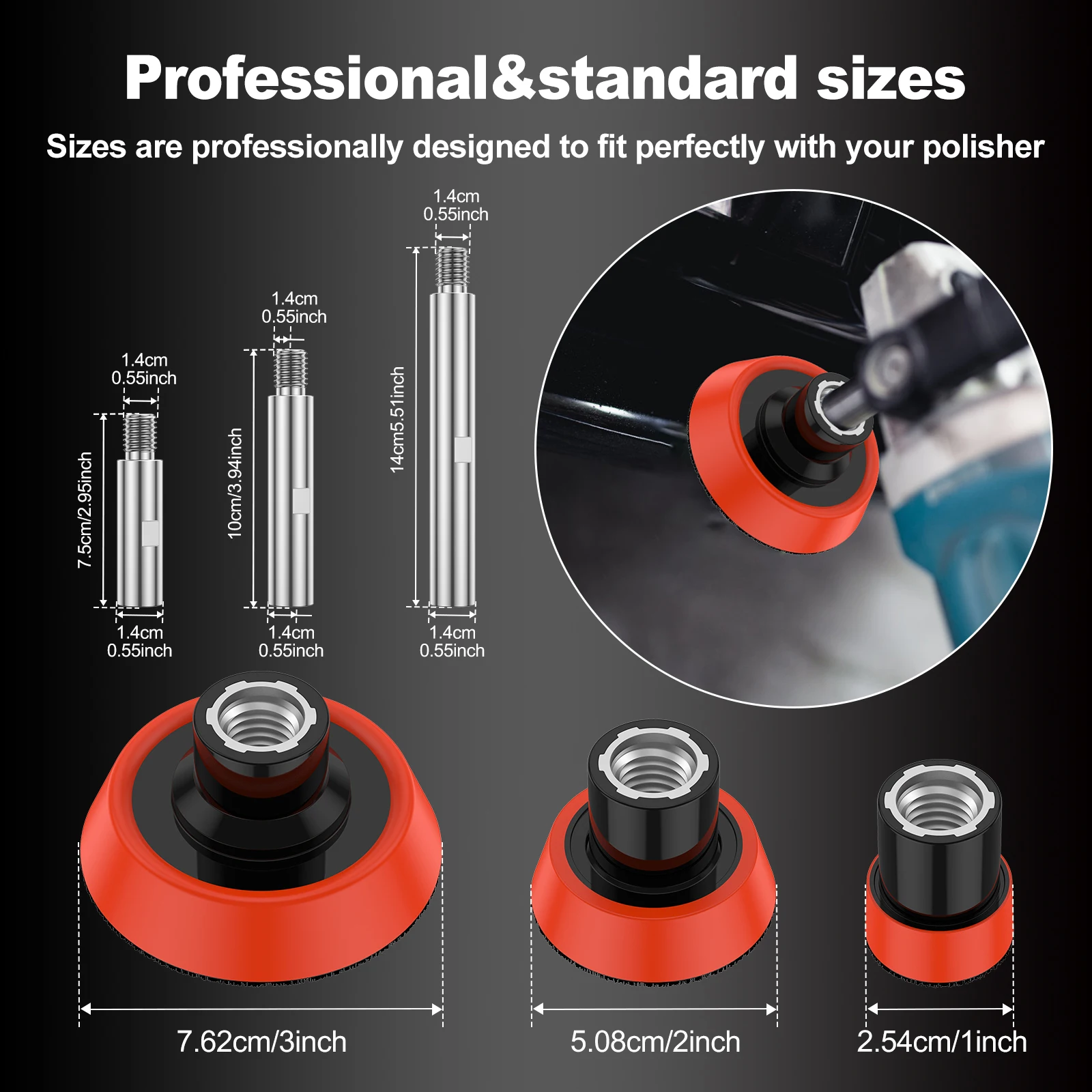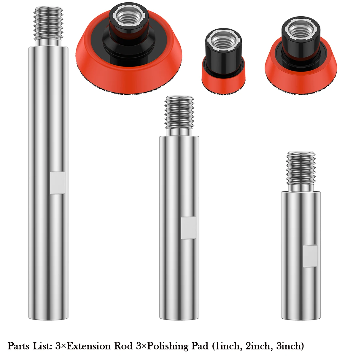 Experience improved precision and reach with this high-quality angle grinder extension set. Designed for professionals and enthusiasts alike, these sturdy steel rods allow you to access tight spaces and complex surfaces effortlessly. The set includes three polished silver extension rods measuring 7.5, 10, and 14 centimeters in length, each with a 14mm diameter for maximum compatibility. Featuring precise 5/8 inch-11 internal and external threads, these rods connect smoothly with standard angle grinders and polishers. The electrophoretic coating ensures durability and stability, offering a fuss-free experience. Additionally, the set includes versatile adapters—14 to 16 and 16 to 14—to customize your setup. Combined with the three polishing pads in 1, 2, and 3-inch sizes, this set makes polishing and grinding tasks more efficient and comfortable. Whether you’re working on car detailing or delicate finishes, this kit provides the flexibility and reliability you need to succeed.