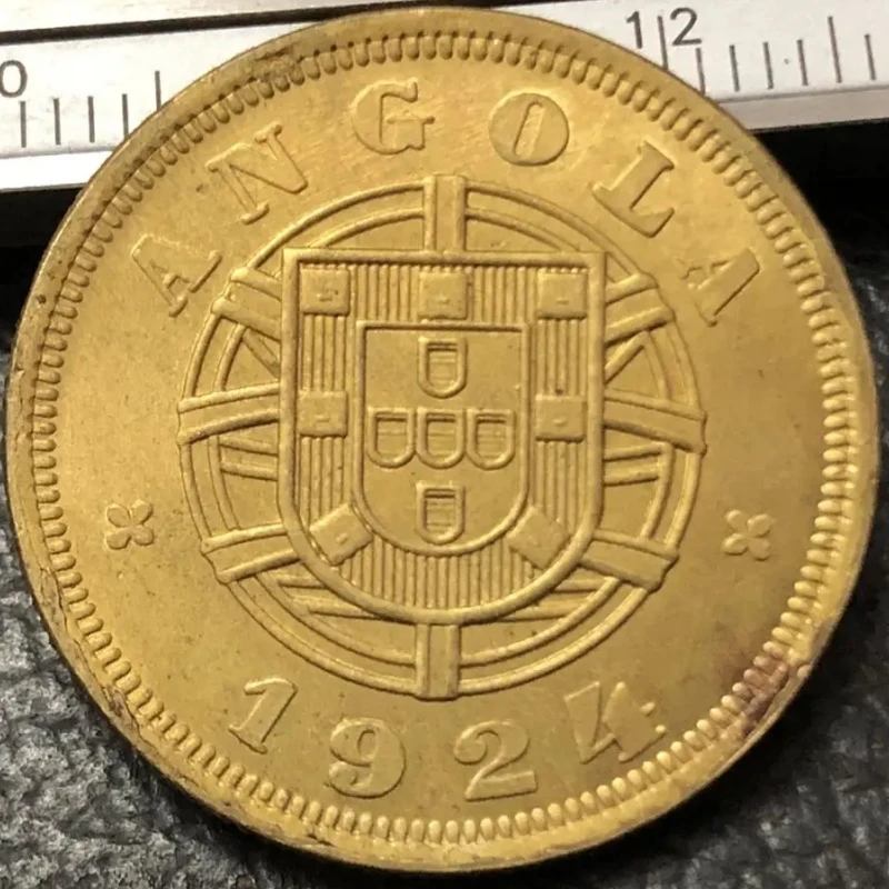 - Designed as a high-quality replica, it features the inscription “ANGOLA” at the top and the year “1924” at the bottom, replicating authentic colonial coinage with detailed relief and aged surface.