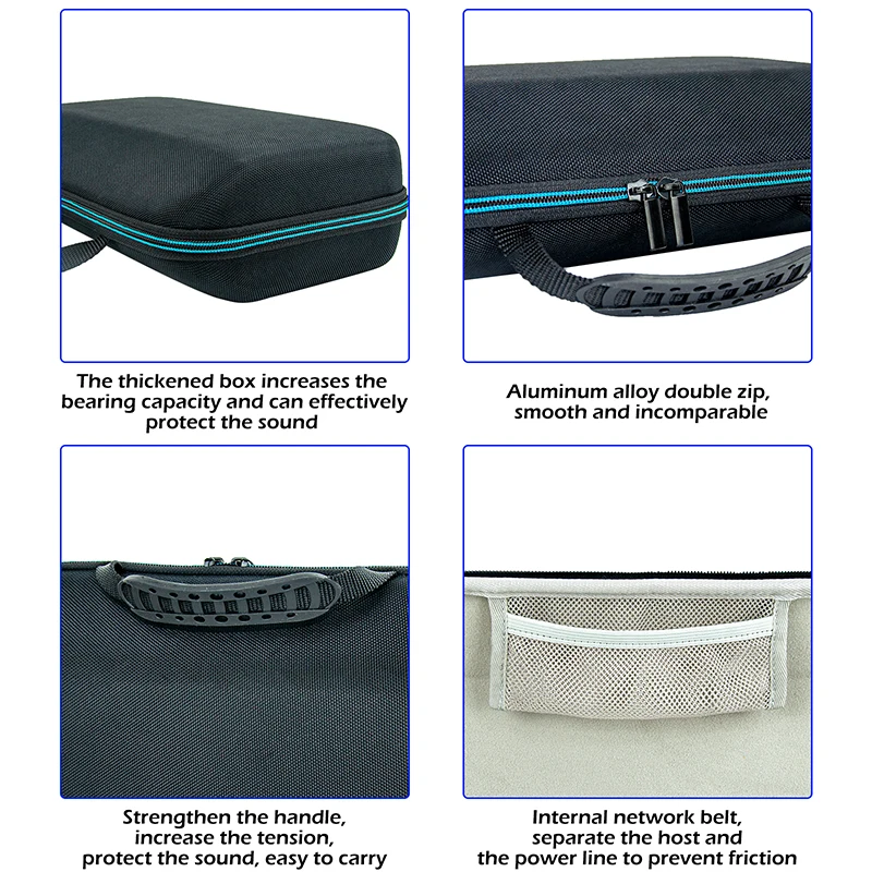 Protect your Anker Soundcore Motion X600 portable high-fidelity speaker with this sleek, black EVA travel case measuring 330mm x 80mm x 205mm and weighing only 300g. Crafted from semi-waterproof, shockproof material, it provides heavy-duty protection against scratches, dust, and impacts. The case features a durable zipper closure, a built-in handle with a portable rope for easy transport, and an interior compartment perfect for small accessories like data cables. Its lightweight, compact design makes it ideal for on-the-go use, ensuring your speaker remains secure and protected wherever your adventures take you.