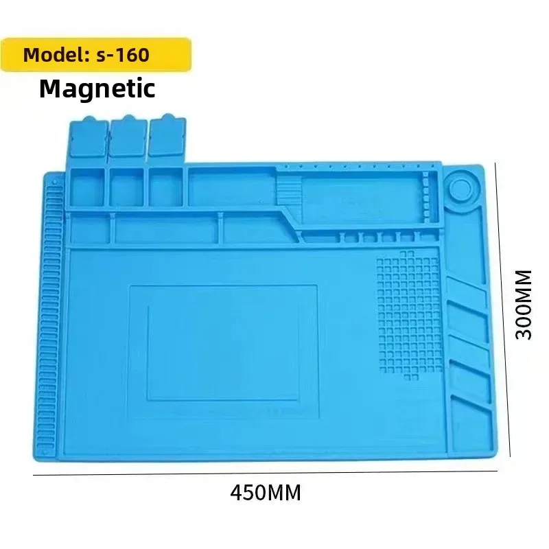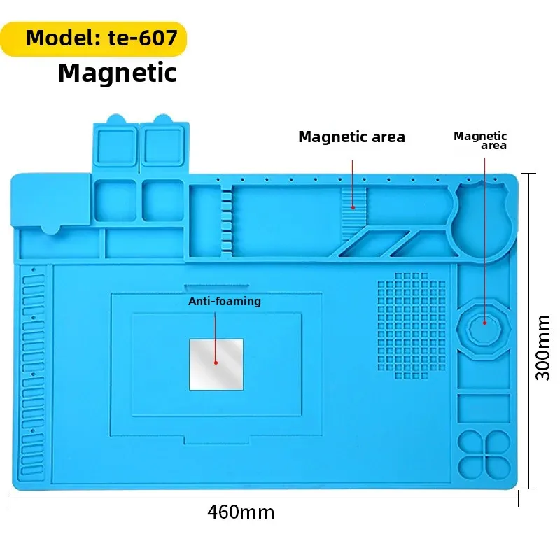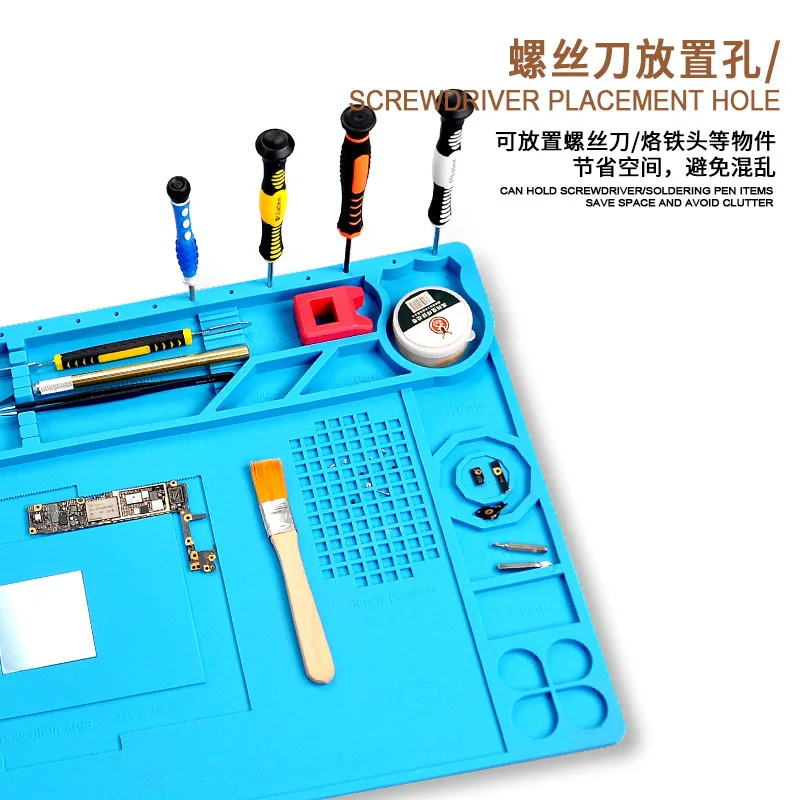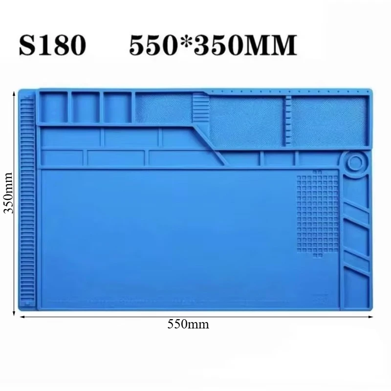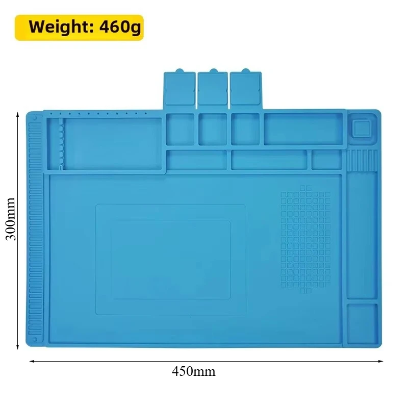 Experience efficient and organized electronic repairs with this professional-grade anti-static ESD soldering silicone work pad, available in sizes from 350x250mm to 550x350mm, including options like 460x300mm, 450x300mm, and 550x350mm. Crafted from heat-resistant silicone material that withstands high temperatures, it provides a flat, smooth surface for precise soldering and phone repair tasks. Features include multiple compartments, grooves, and sections to securely hold tools and components, along with anti-static properties that protect delicate electronic parts from static discharge. Perfect for professionals and enthusiasts alike, this durable and highly functional silicone mat ensures a clean, efficient workspace for all your electronic projects.