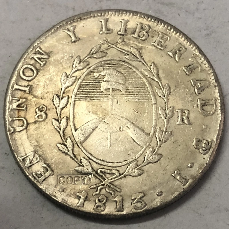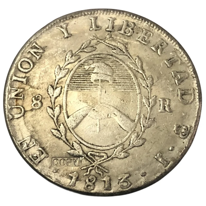 Experience the timeless appeal of this meticulously crafted replica coin, designed to evoke the antique charm of early 19th-century numismatic art. Measuring precisely 37mm in diameter, this silver-colored cast coin features a detailed engraved face that captures the intricate artistry of its historical inspiration. The central oval area displays layered horizontal lines, hinting at stylized imagery or figures reminiscent of the 1800s, all reinforced by a polished, reflective surface that enhances every fine detail. Encircling this central motif is a finely designed laurel or olive branch wreath, symbolizing victory and peace. The coin's raised perimeter features Latin or English inscriptions, including the legendary “LIBER-TRAD-” and the year “1813,” adding a regal vintage aesthetic. Its beaded, reeded edge completes this antique look. A small “COPY” mark confirms it’s a replica, making it an excellent collectible and decorative piece for enthusiasts and historians alike.