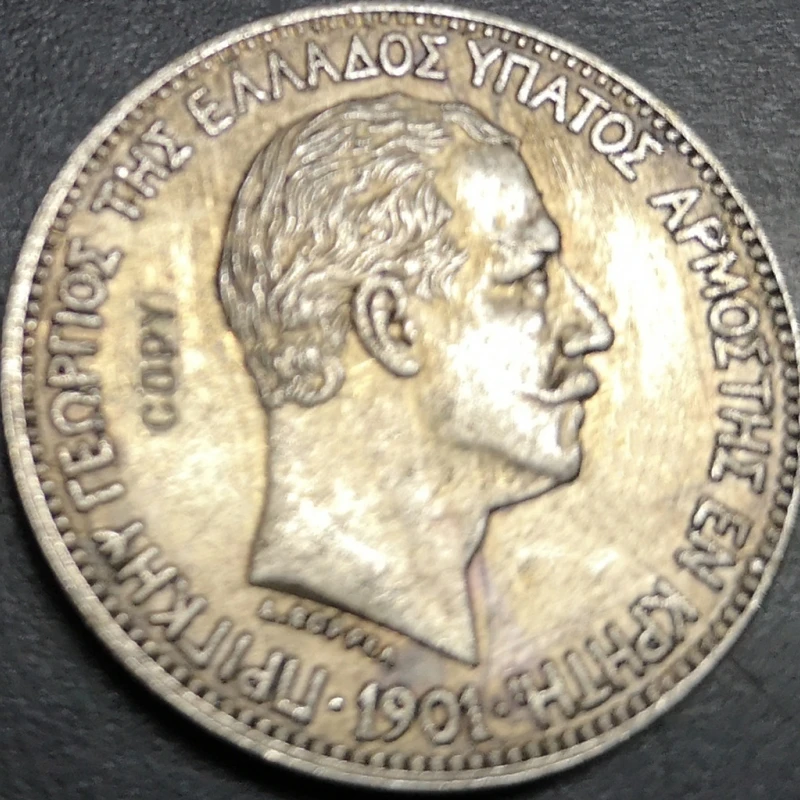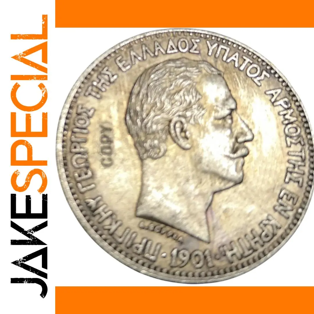 Discover the timeless charm of this intricately crafted replica coin inspired by early 20th-century European currency. Featuring a detailed portrait of a distinguished man with finely rendered hair swept back, prominent nose, and strong jawline, it exudes an authentic vintage aura. The surface displays a textured, aged finish, accented with darker tones in recessed areas to enhance contrast and depth. Surrounding the portrait, Greek inscriptions “ΤΗΣ ΕΛΛΑΔΟΣ ΥΠΑΤΟΥ ΑΡΧΟΝΤΟΣ” (Of Greece, High Commissioner) and the year “1901” highlight its historical significance. The coin is finished with a dotted border, adding decorative appeal, and is made from a durable metal material, perfect for collectors with an appreciation for antique European aesthetics. Its ornate design captures the elegance and craftsmanship of the era, making it an exceptional collectible piece for history enthusiasts.