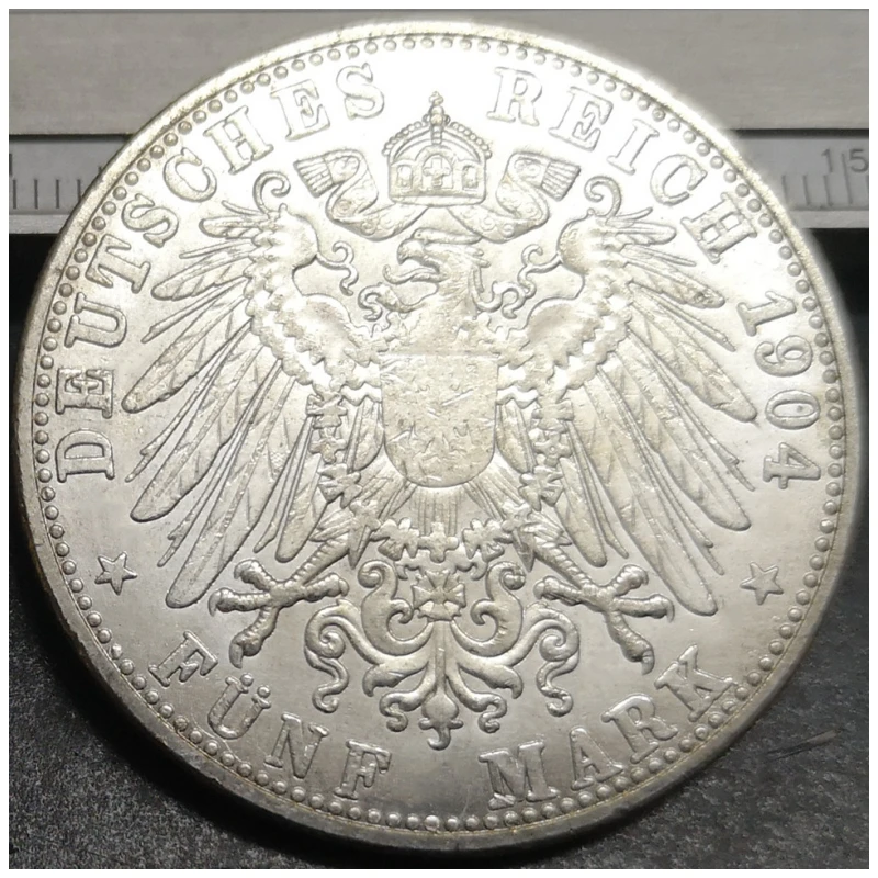 This antique-style replica of the 1904 Lubeck 5 Mark coin