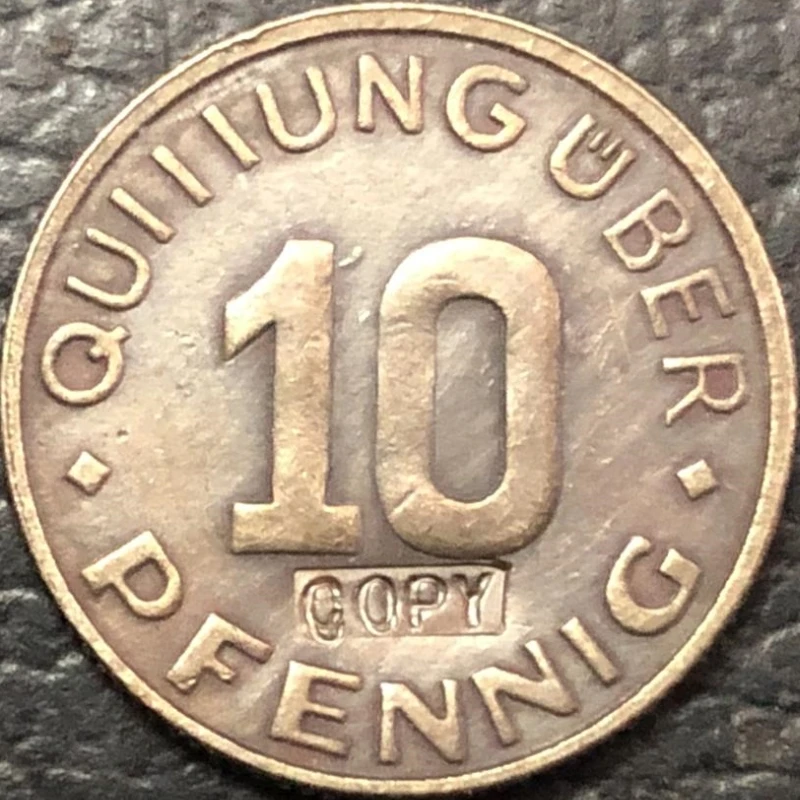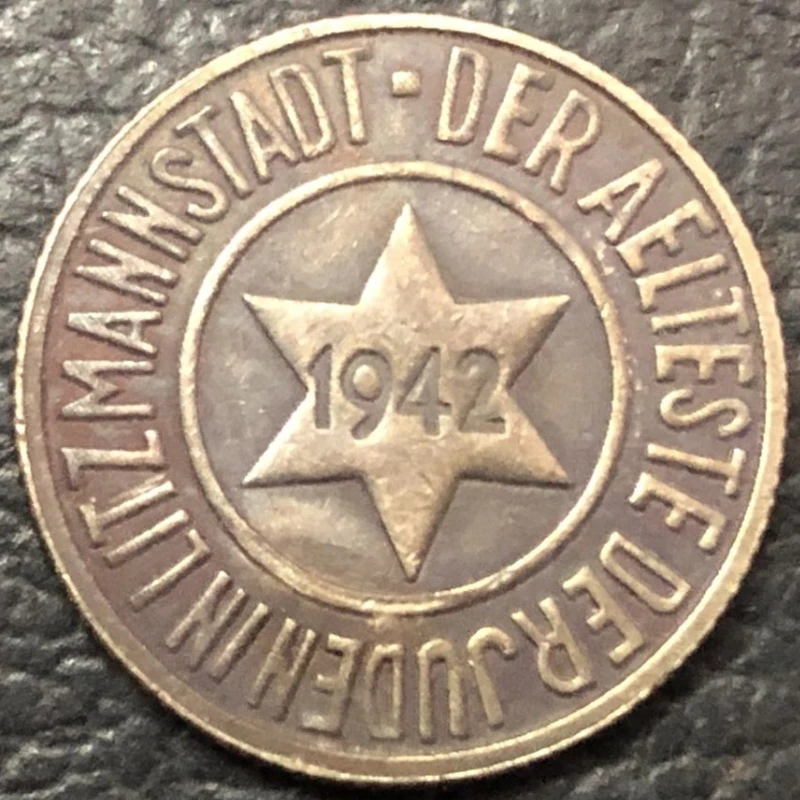 - This coin is a faithful cast replica of the original 1942 Poland 10 Pfennig Lodz Ghetto coin, featuring precise textured surface and vintage patina for authentic appearance.