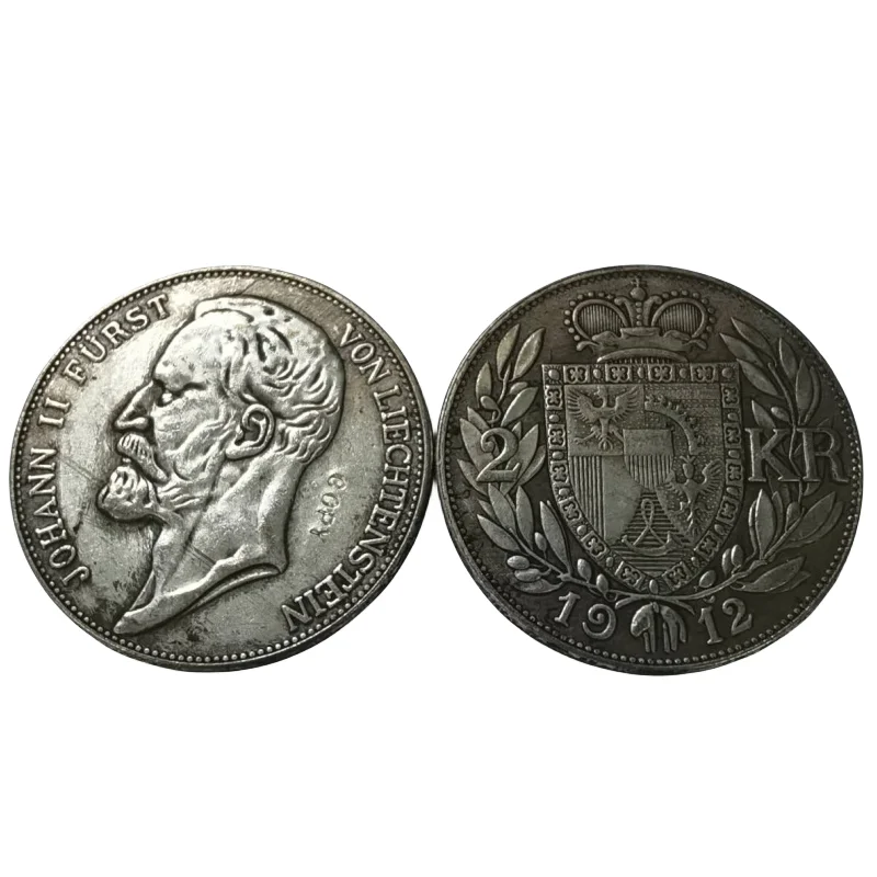 Step into the rich history of European currency with this beautifully crafted copper replica of the 1912 Liechtenstein 2 Kronen silver coin. Designed to resemble an antique, cast in a warm copper hue, this coin exudes vintage charm. The detailed portrait features Johan II, capturing fine facial features such as a prominent forehead, sharp nose, textured hair, and a distinguished beard, adding depth and realism. The obverse is framed with a dotted border, enhancing its ornate appearance. The reverse showcases a heraldic shield topped with a crown, enclosed by a wreath of intricately detailed leaves, and flanked by the denomination “2 KR” and the year “1912.” A perfect decorative piece for collectors or history enthusiasts who value craftsmanship and historical detail.