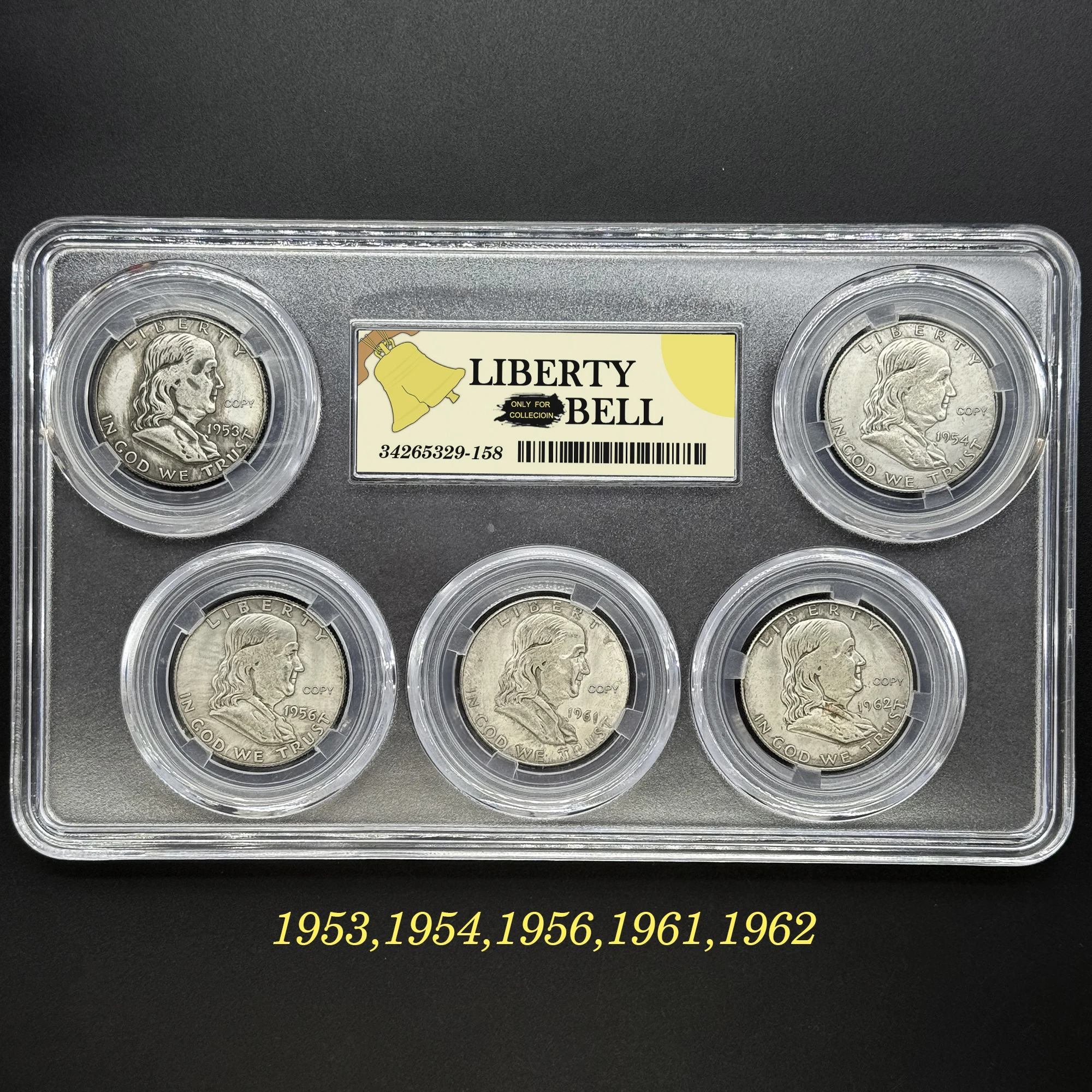 - Includes five copper replica coins, each 31mm in diameter, reflecting vintage US patriotic themes from 1948 to 1962 with textured, detailed designs.