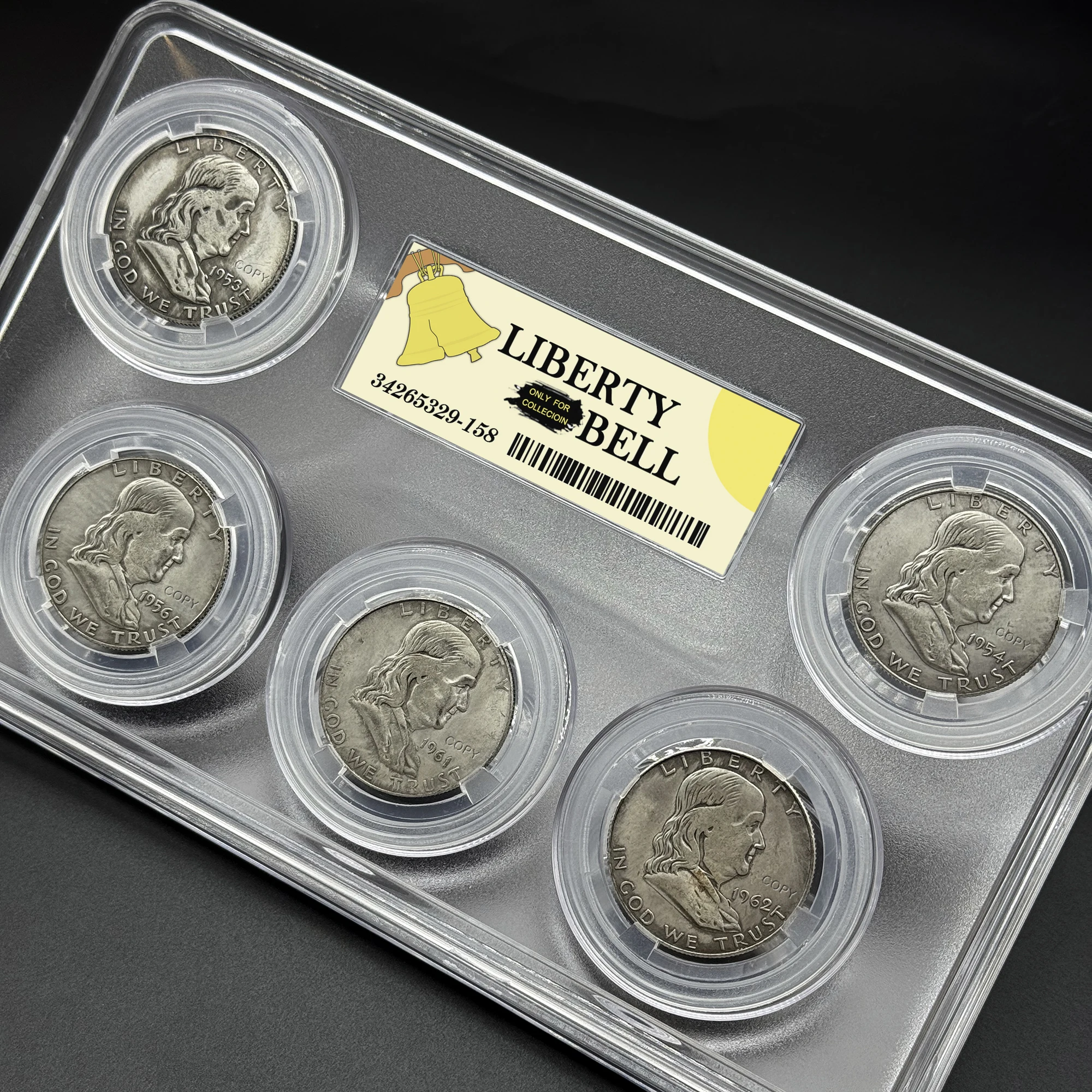 Immerse yourself in a nostalgic journey with this set of five meticulously crafted antique-style copper coins, each measuring approximately 31mm in diameter. Designed to reflect vintage U.S. history from 1948 to 1962, these coins showcase detailed carvings of patriotic figures and inscriptions like “LIBERTY” and “IN GOD WE TRUST.” Their weathered, aged finish and textured surfaces evoke a genuine antique look, perfect for collectors or as unique display pieces. The subtle color variations, spanning two distinct periods (1948-1952 and 1953-1962), enhance their historical authenticity. Encased in transparent plastic holders, these coins are not only visually appealing but also preserve their intricate details, making them an ideal addition to your collection or patriotic decor.