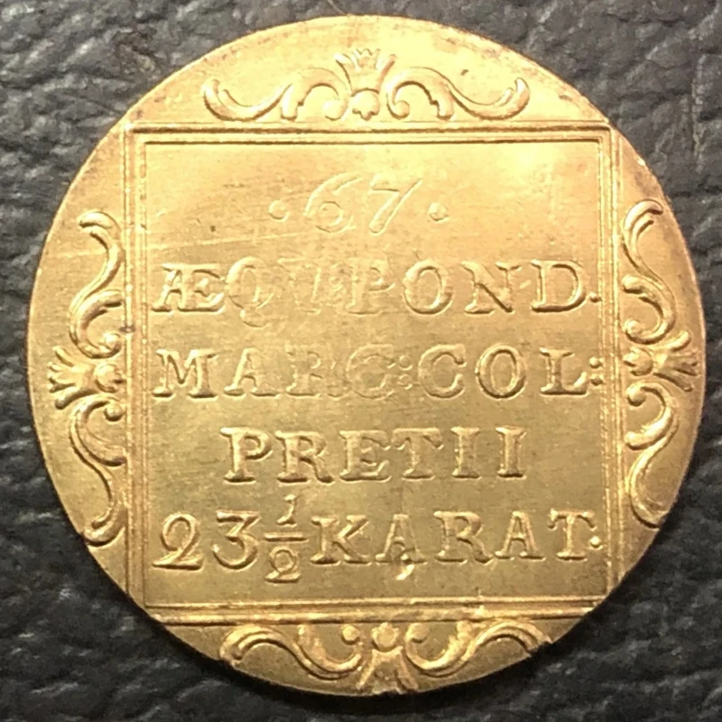 Imagine owning a beautifully crafted reproduction of an 1819 Hamburg Duchy gold ducat, designed to evoke the elegance of European history. This coin's antique appearance is achieved through detailed casting, highlighting its textured matte finish and aged patina. Its intricate design features engraved text within a rectangular frame, accented by decorative, ornate borders of scrollwork and flourishes, adding a regal touch. The symmetrical embellishments and darker recesses enhance the vintage allure, making it a perfect collectible or decorative piece for history enthusiasts. Although it’s a copy, its craftsmanship convincingly replicates the authenticity and grandeur of centuries-old European coins, providing a unique aesthetic that invites admiration and interest.