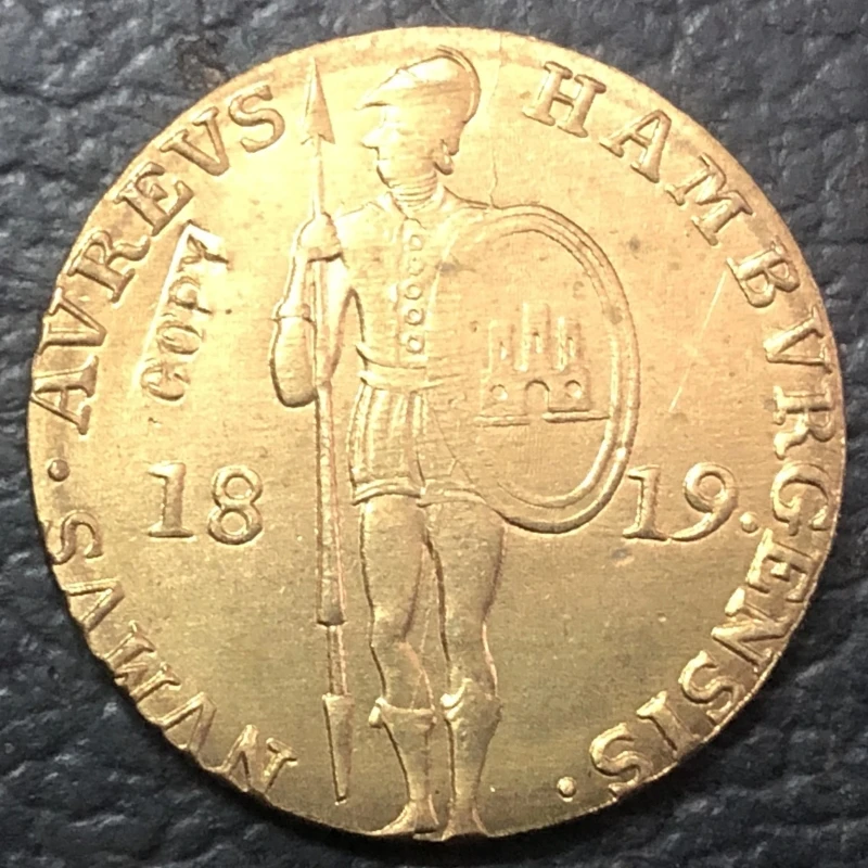 - This coin is a detailed replica of the 1819 Hamburg Duchy ducat, cast in metal with antique European styling to evoke historical authenticity.