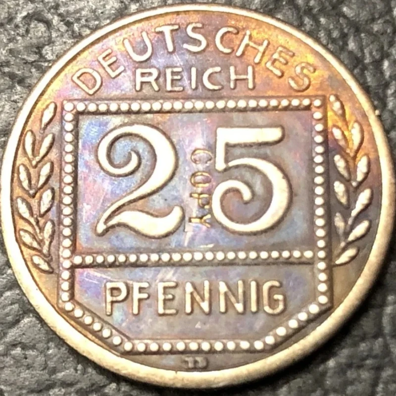 Immerse yourself in history with this beautifully crafted replica of an 1840 or earlier German 25 Pfennig coin. Its vintage design captures the essence of early 19th-century European craftsmanship, featuring intricate embossed details and a distinguished patina finish. The coin’s iridescent surface subtly reflects light, highlighting its antique appeal and detailed decoration. The central “25” boldly stands out, complemented by a small vertical logo and the inscription “PFENNIG” inside a dotted, rounded rectangular border. Encircling the face, the elegant laurel wreath enhances its classic aesthetic. This reproduction offers a unique collectible or decorative piece that embodies patriotism and historical charm, perfect for enthusiasts who appreciate the artistry of vintage coinage.