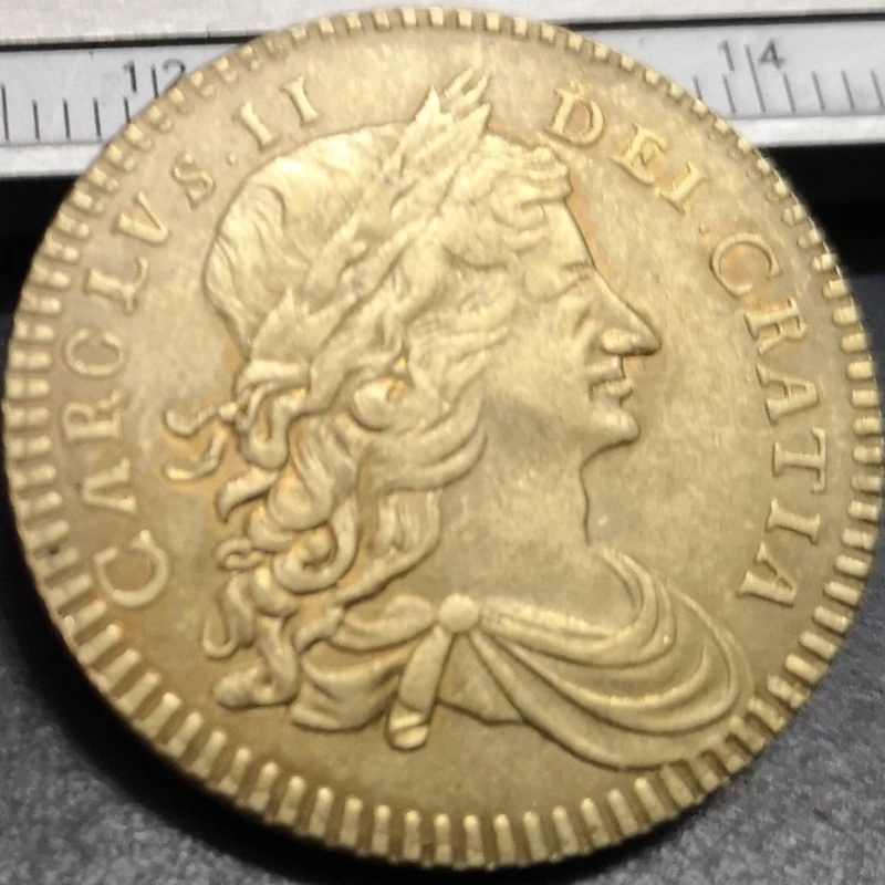 Step into history with this beautifully crafted replica of the 1684 Ireland half penny from the Charles II era. Measuring approximately 27mm in diameter, this coin features a tarnished, antiqued finish that vividly mimics the aged look of genuine vintage currency. Its detailed design showcases a crown adorned with small beaded outlines, a prominent harp symbolizing Ireland, and an elegant profile of Queen Elizabeth II with finely detailed features. Encircling the imagery is a ring of small raised letters and the inscription “ELIZABETH II D.G. REG. F.D.” along the coin’s perimeter. The beaded border adds to its ornate, vintage appeal. Perfect for collectors, this piece offers authentic-style aesthetics with a nostalgic, historical charm, making it an exquisite addition to any collection.