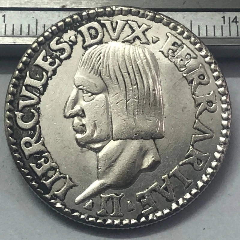 Step into history with this beautifully crafted cast metal imitation coin, styled like a genuine European currency from Italy, circa 1471-1505. The coin features a detailed profile portrait of a historical figure, capturing the textured appearance of short, straight hair, sharp facial features, and a serious expression. Its circular shape is complemented by a raised beaded border, giving it an authentic vintage feel. The surface exhibits a weathered, matte finish, heightening its antique aesthetic. This replica offers a tactile sense of history, making it perfect for collectors, display, or costume use. Its intricate detailing emphasizes craftsmanship, providing a tangible connection to Europe’s rich past. Own a piece of history that’s visually stunning and historically inspired.