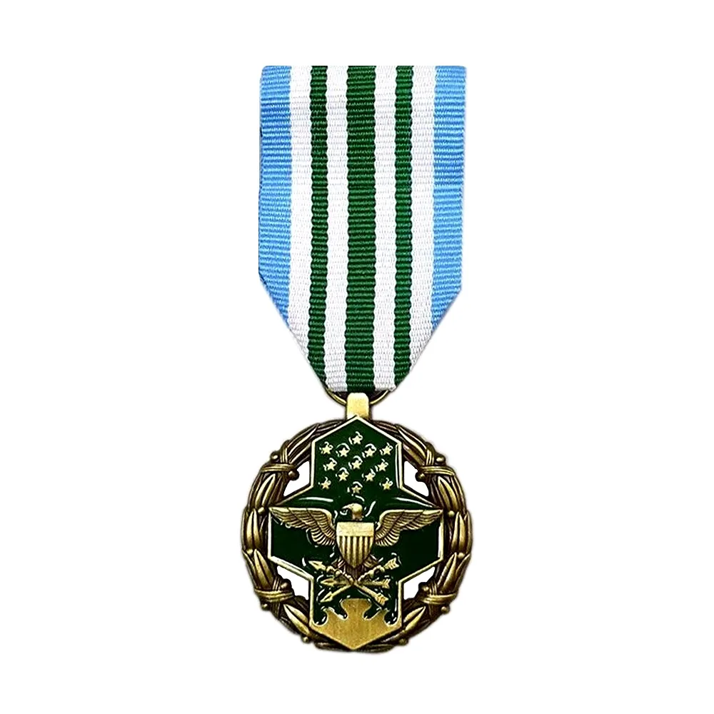 This unisex medal features a circular design with a central emblem encompassed by a golden laurel wreath, highlighting a retro military style. The striking dark green background showcases a stylized eagle motif, symbolizing strength and valor, resting atop crossed weapons. Complementing its sophisticated appearance, the golden laurel enhances the medal’s prestige. Attached is a blue ribbon featuring vertical green and white stripes, perfect for a classic military look. Made from durable alloy, its metallic finish adds to the vintage aesthetic. Ideal for embellishing jackets, backpacks, hats, or for your DIY clothing projects, this versatile piece is truly a standout.