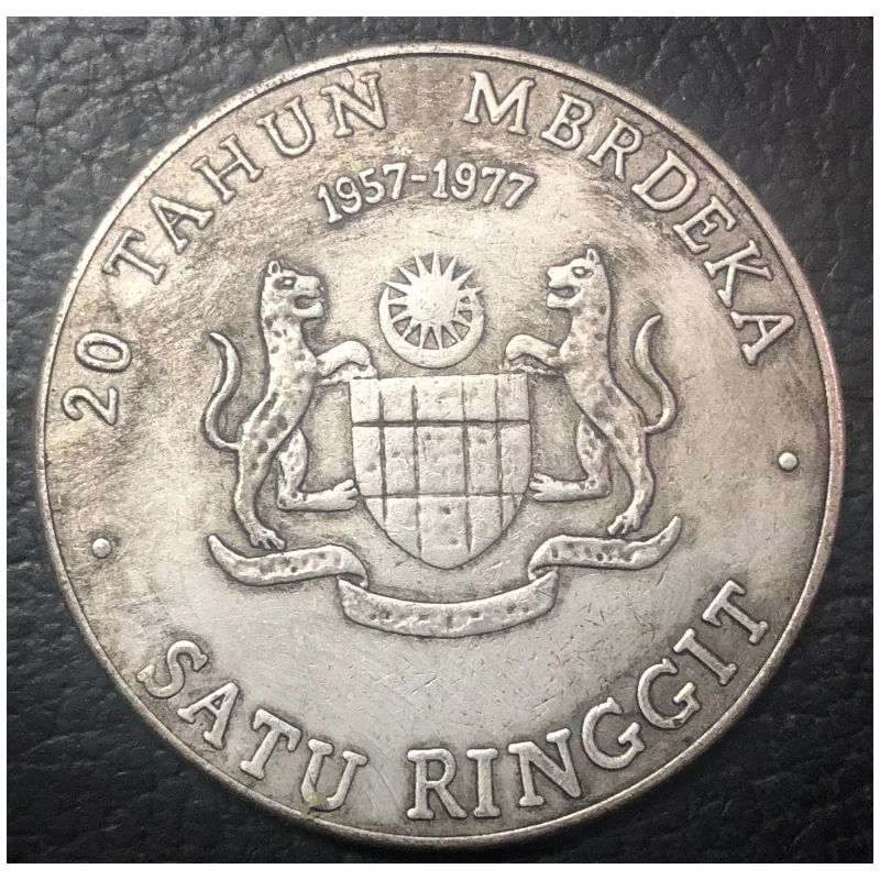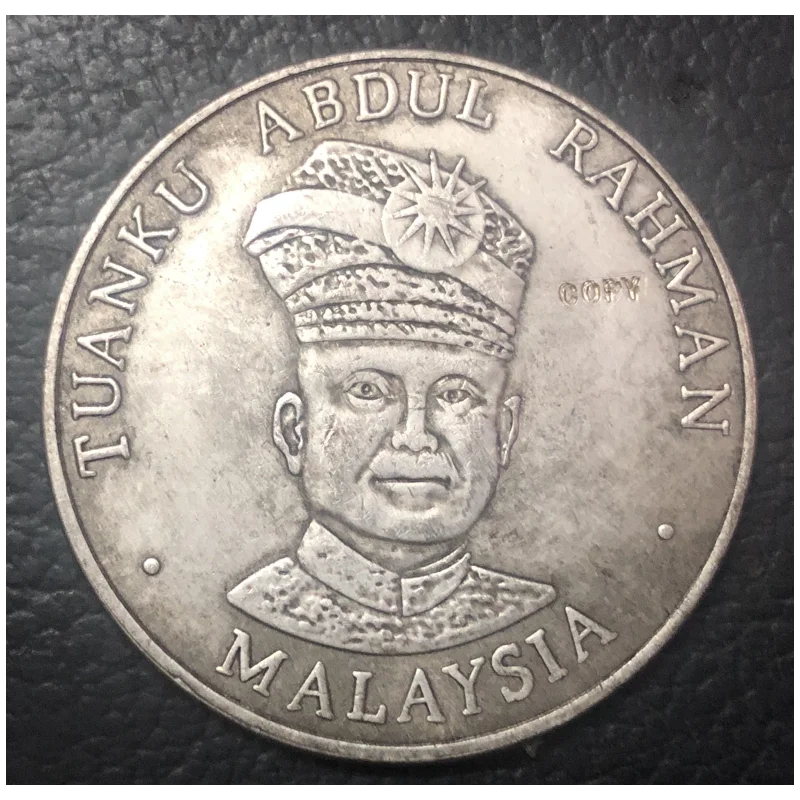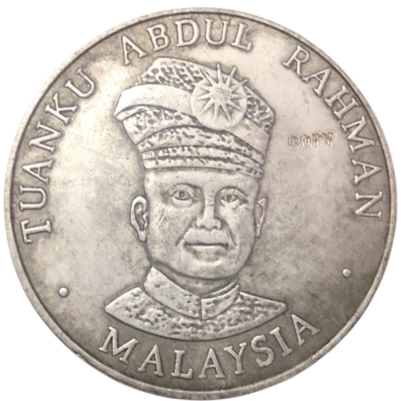 - This coin is a copy replica of the 1977 Malaysia 1 Ringgit, made of metal with casting technics, featuring an antique vintage appearance with detailed relief design.