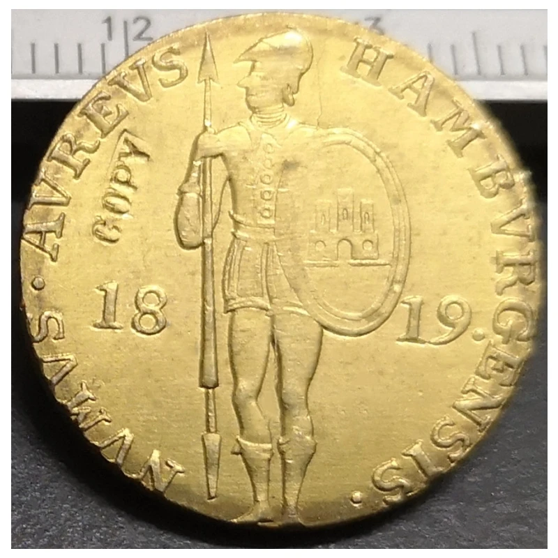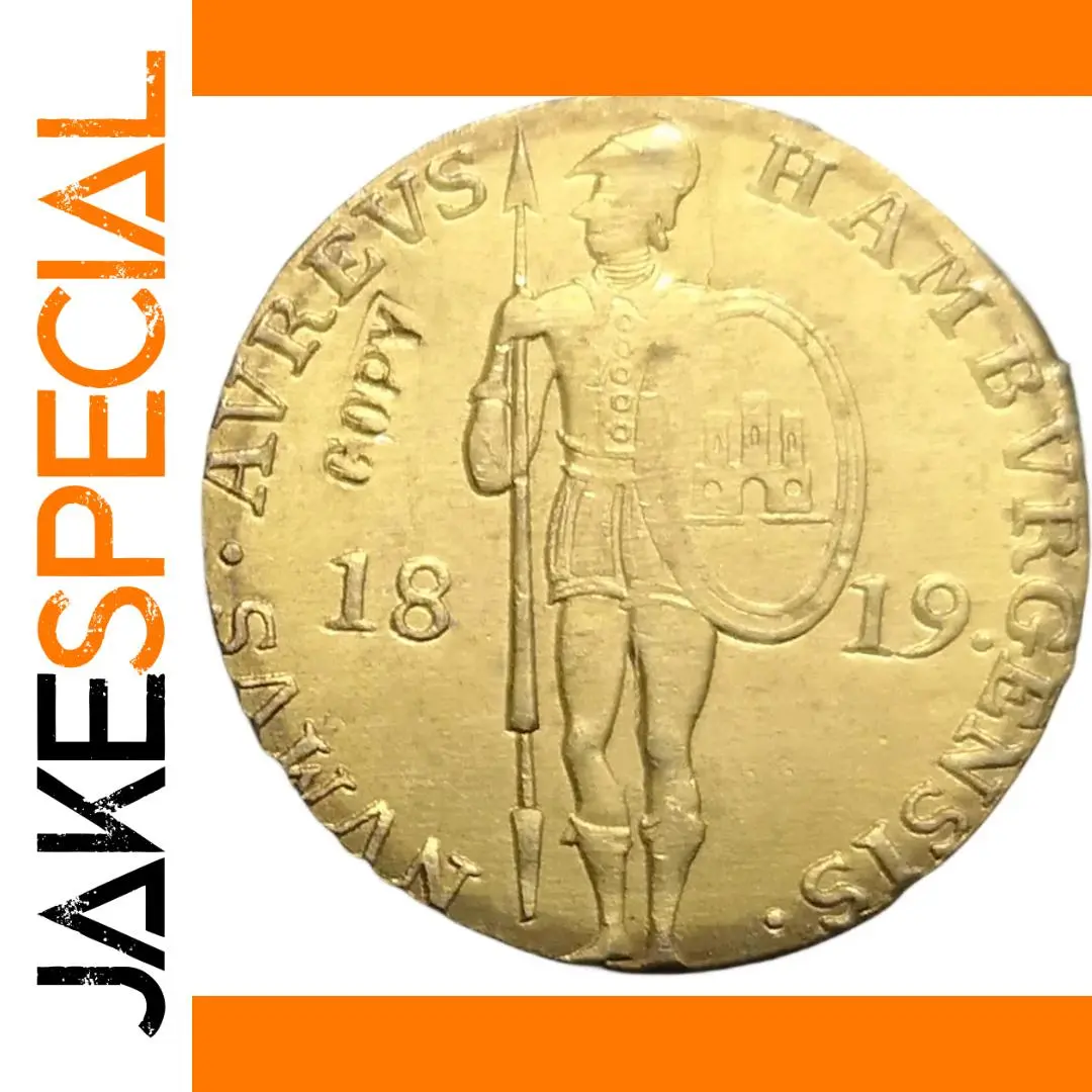 Imagine owning a piece of European history with this beautifully crafted replica coin inspired by Hamburg from 1840 or earlier. The coin showcases a rich, vintage aesthetic, with a textured surface that mimics aged metal and a subtle metallic sheen that evokes antique charm. Its detailed engravings depict a noble figure in period attire, complete with a hat or helmet, holding a staff and shield decorated with intricate architectural elements. The irregular cast edge and slight wear add authenticity, giving it a truly historic appearance. Perfect for collectors or history enthusiasts, this coin brings a touch of 19th-century Europe to your collection, showcasing craftsmanship and regional elegance in a stunning imitation. A unique piece that tells a story across time.