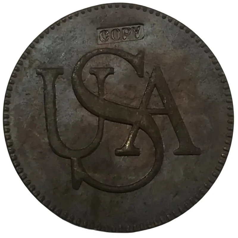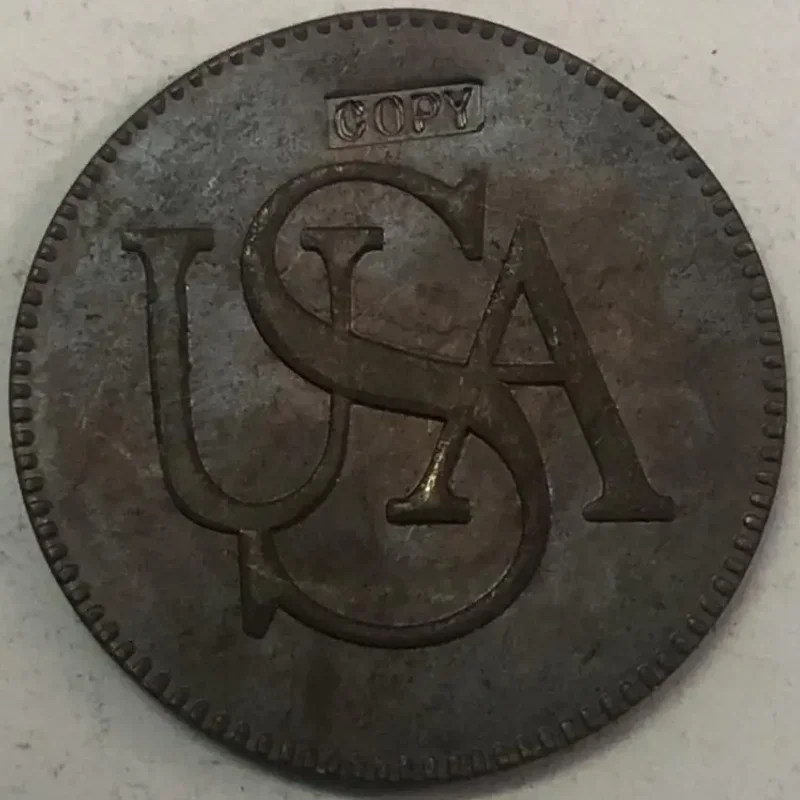 Immerse yourself in history with this beautifully crafted replica of an antique US coin. Designed to evoke the charm of coins from 1840 or earlier, it features a textured, aged copper finish that enhances its vintage appeal. The bold “USA” inscription sits prominently at the center, layered and raised to mimic genuine craftsmanship, while a border of beaded detailing encircles the entire coin, adding a touch of classical elegance. The rectangular “COPY” plaque at the top clearly indicates its reproducing nature while maintaining a sense of authenticity. Perfect for collectors, displays, or patriotic decorations, this coin combines historical aesthetics with detailed artistry to bring a nostalgic patriotism into your collection or environment. Its durable metal construction ensures it maintains its antique look for years.