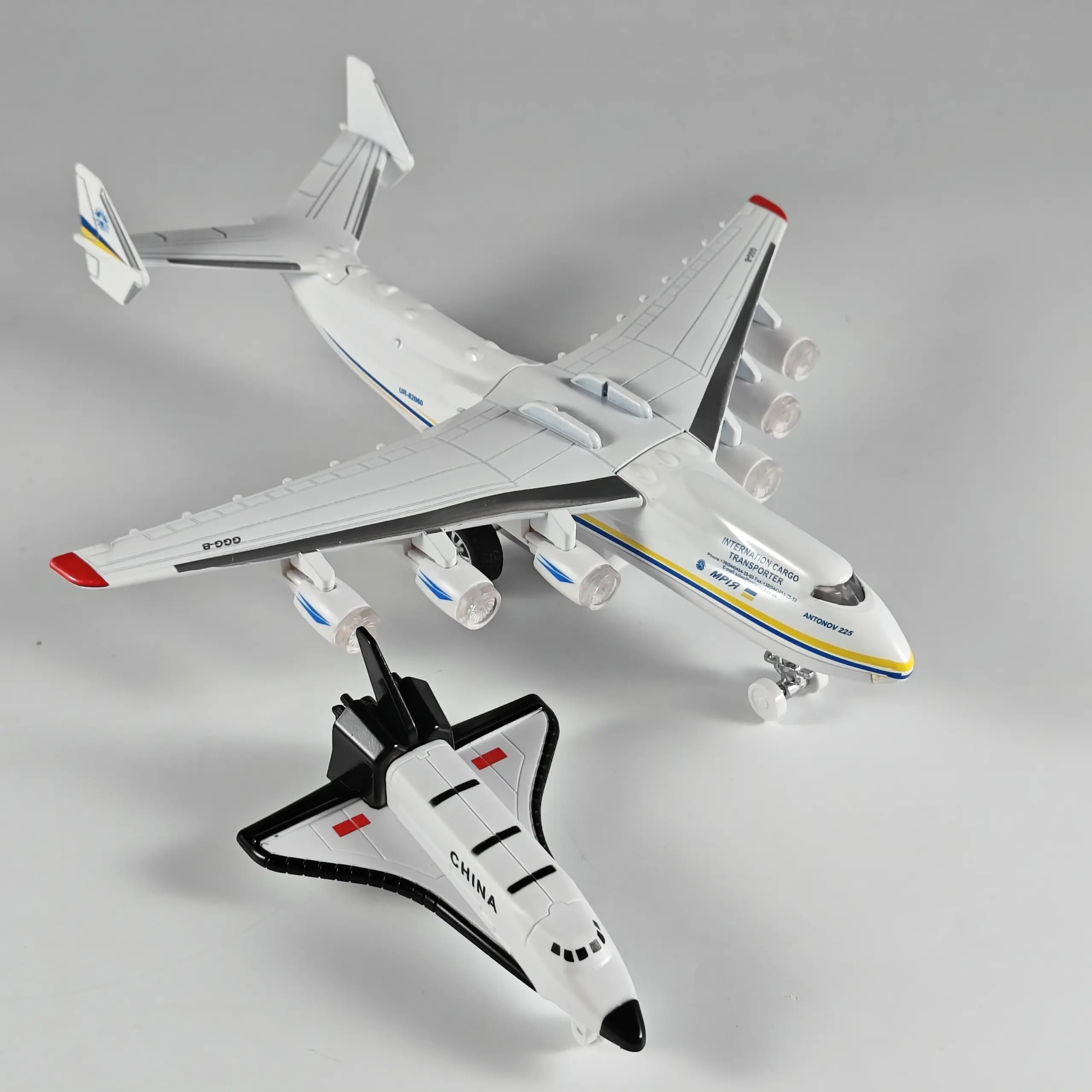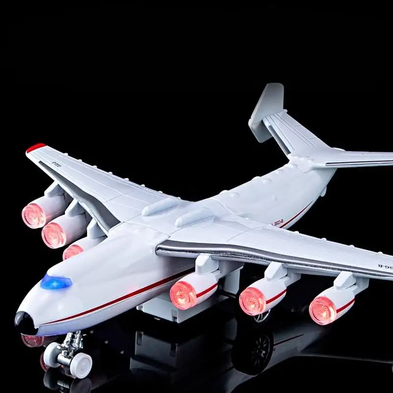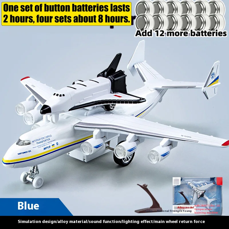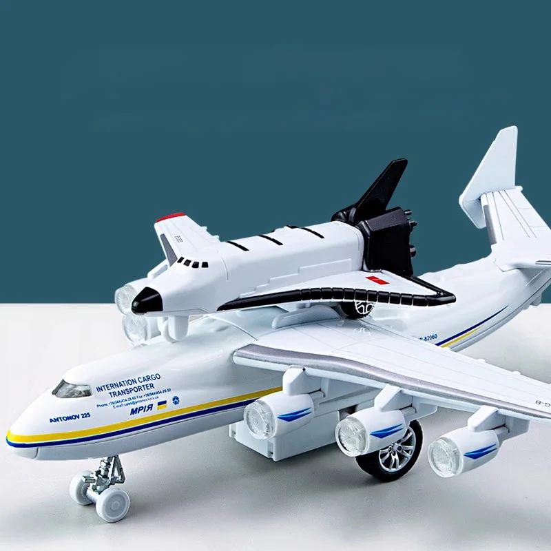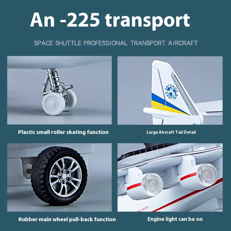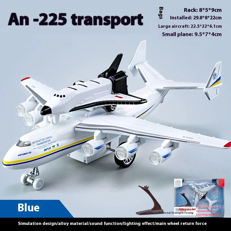 - Features vibrant blue and yellow accents on a sleek white fuselage, with detailed printed logos including “INTERNATIONAL CARGO TRANSPORTER” and “ANTONOV 225” for authenticity.