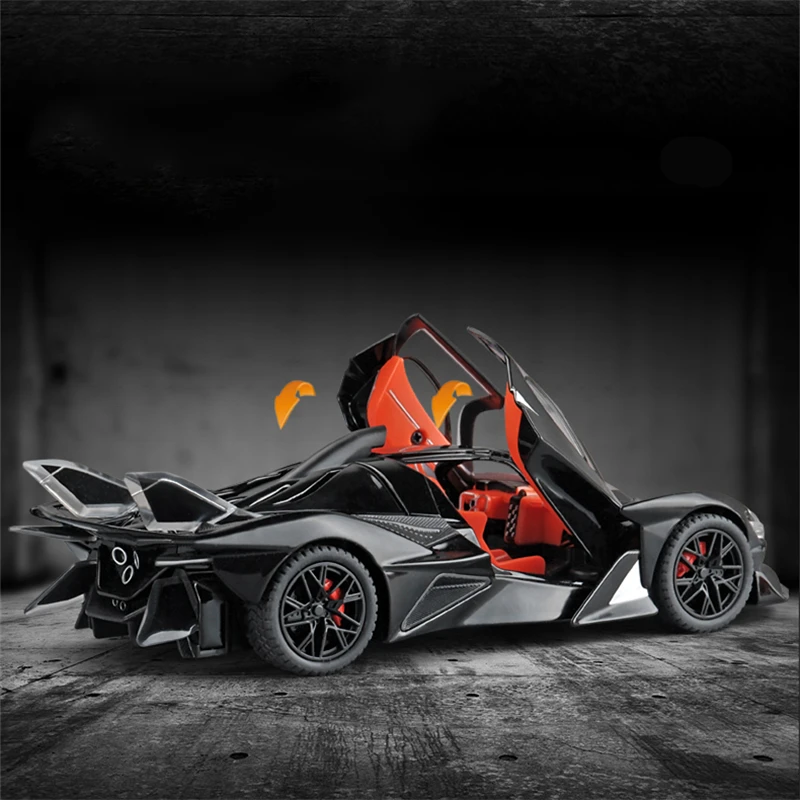 Imagine owning a meticulously crafted model that captures the essence of high-performance racing. This 1:24 scale diecast alloy sports car boasts a sleek, aggressive aesthetic, with a glossy black finish that reflects light and enhances its dynamic presence. Its aerodynamic lines, angular contours, and low, wide stance evoke speed and power, making it a perfect display piece. The large, curved windshield seamlessly integrates into a streamlined roofline, while the high-mounted rear spoiler adds realism. Inside, bold red racing seats create a striking contrast against the exterior’s dark tone, embodying high-performance racing style. The black multi-spoke wheels with rubberized tires complete its authentic look, making it an impressive addition to any collection or display.