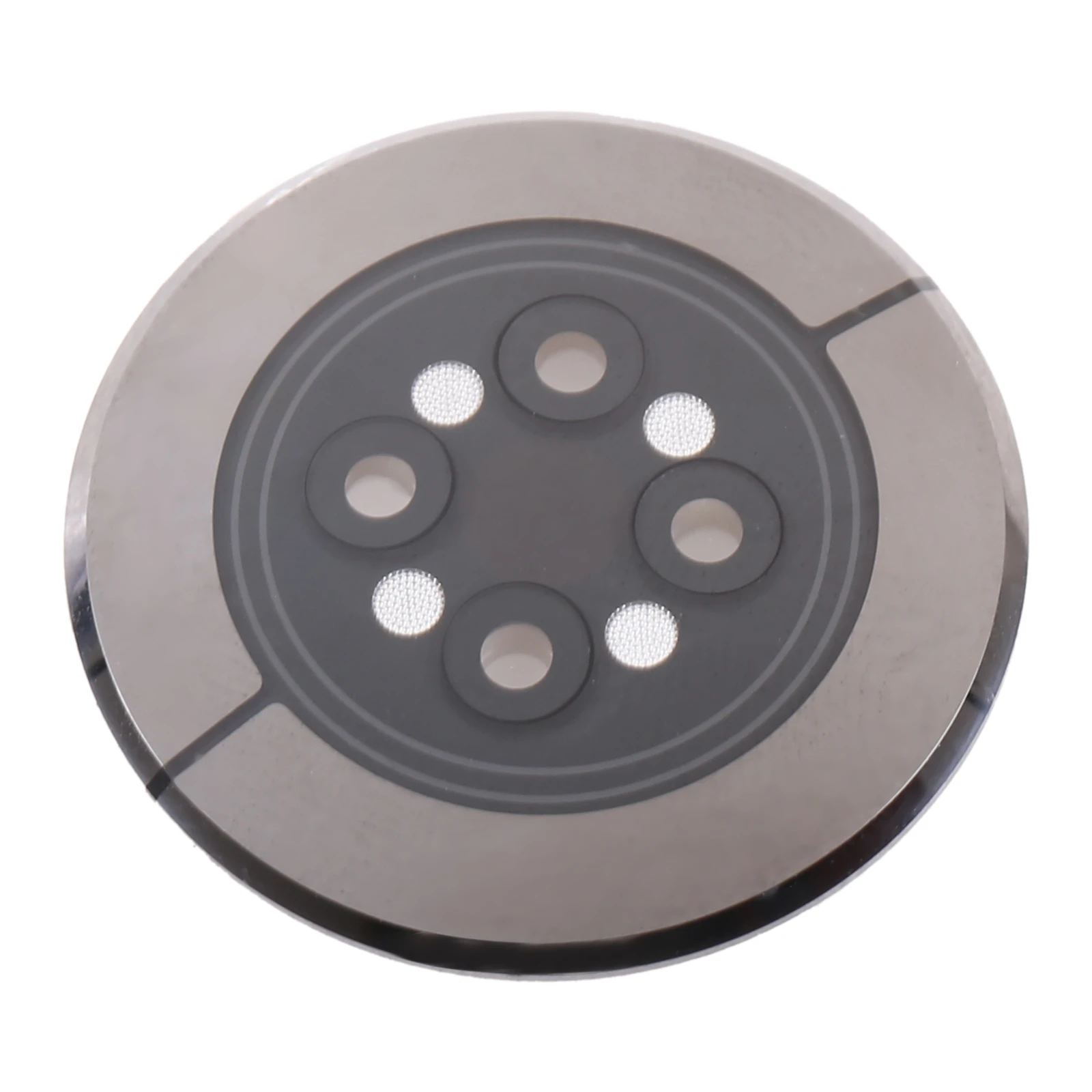 - The matte dark grey or black center surface provides a sleek aesthetic, contrasted by six precisely arranged circular cut-outs for sensors or internal components, emphasizing technical craftsmanship.
