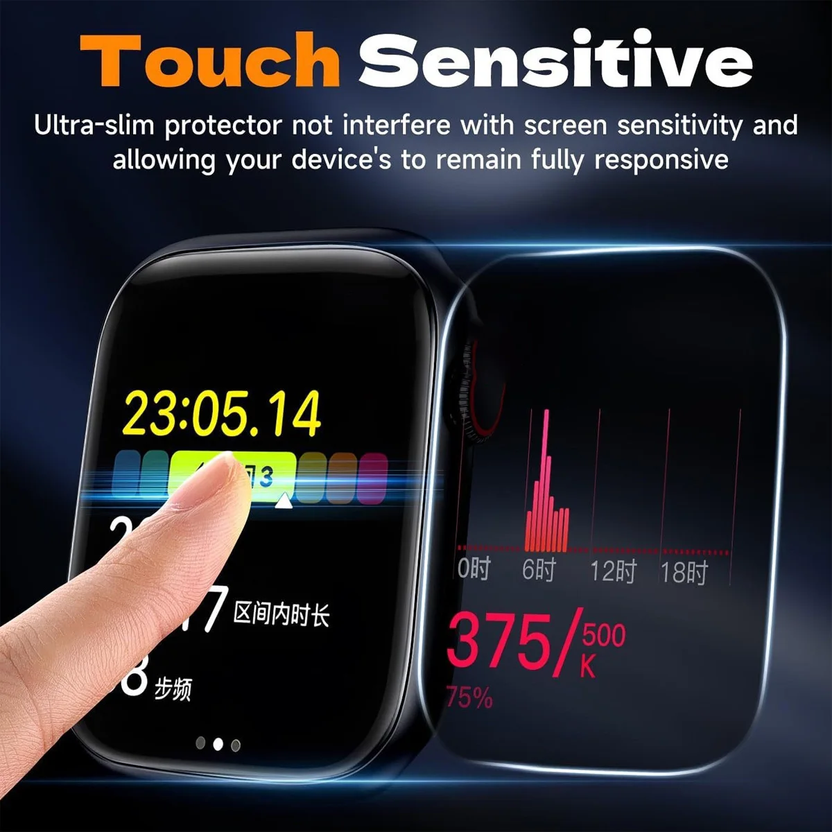 Experience the perfect fit and sleek design of this this clear hydrogel screen protector, compatible with a wide range of Apple Watch models including series 4 to 10 and Ultra 2 49mm. Crafted from high-quality, ultra-thin hydrogel material, it offers excellent transparency, flexibility, and protection against scratches and impacts. The smooth, glossy surface ensures your watch maintains its elegant appearance while providing a seamless touch experience. Its precise cutouts and edge-to-edge coverage are designed to complement the rounded square face of each specific model, ensuring a perfect, bubble-free installation. With the included orange application tool, installing this film becomes effortless, giving you a professional finish. Protect your watch with this minimalist, highly functional accessory.