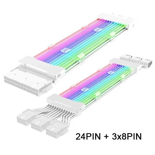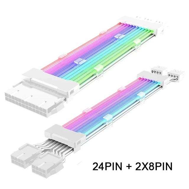 The ARGB PSU Power Supply Extension Cable is your perfect companion for custom PC builds, designed with vibrant RGB colors that enhance your gaming rig's aesthetic. Measuring 265mm, this cable features a 24-pin ATX connector along with dual 8-pin (6+2) PCIe connectors, ensuring compatibility with a variety of modern graphics cards. Crafted from high-quality PVC and tinned copper, it provides superior durability and reliability under high current loads. The cable maintains a striking visual effect even in bright environments, allowing you to showcase your setup beautifully. With options in chic black and white, elevate your PC's lighting to embody your personal style seamlessly.