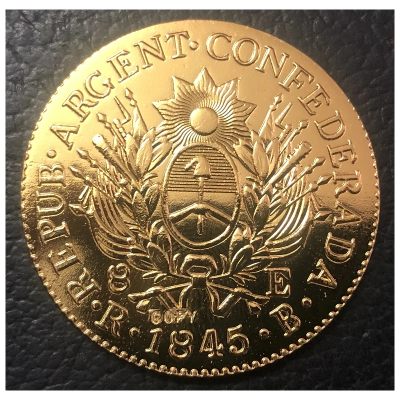 - Encircled by raised dotted border grooves, with inscriptions “REPUBLICA ARGENTINA” and “1845,” separated by small decorative dots for added visual appeal.