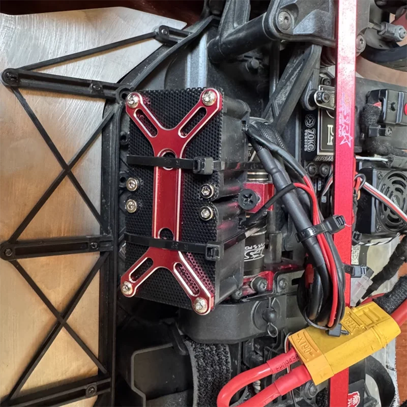 Transform your high-performance ARRMA RC vehicle with this sleek, durable metal fan bracket kit. Designed specifically for 1/7, 1/8, and 1/10 scale models like Mojave, Typhon, Kraton, and Outcast, this component ensures your motor stays cool during demanding runs. Featuring an industrial yet modern aesthetic, the bracket boasts a perforated, vented surface for optimal airflow, while the reinforced X-shape design offers exceptional strength. Available in vibrant colors—red, blue, and black—this upgrade seamlessly blends durability with style. Installation is straightforward, and it provides a reliable solution to improve motor performance, reduce heat buildup, and extend your vehicle's lifespan. Experience enhanced cooling efficiency with this premium upgrade part.