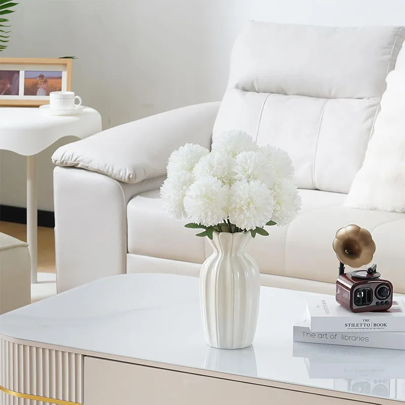 Transform your space with this stunning artificial chrysanthemum bouquet. Crafted with high-quality silk, each of the 10 large flowers features a delicate, realistic design with textured petals, subtle veins, and vibrant color. The full, round blossoms measure 4.3″ in diameter, showcasing intricately detailed ruffled petals that mimic real chrysanthemums, adding depth and sophistication to any setting. The stems, measuring 9.84″ in length, are made from a durable blend of plastic and silk, creating a natural appearance. Arranged to reach a total height of approximately 15.5″, this lush bouquet provides a fresh, spring-like aesthetic perfect for home decor, weddings, parties, or as a thoughtful gift. Its versatile design ensures lasting beauty without wilting or fading over time.