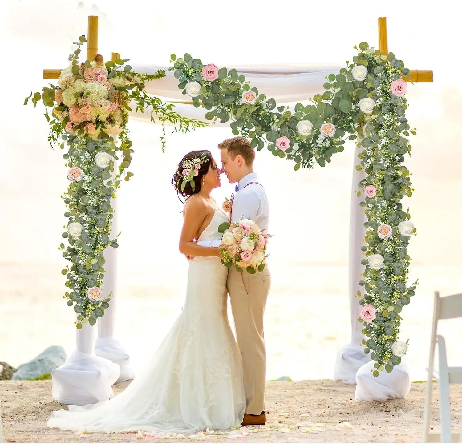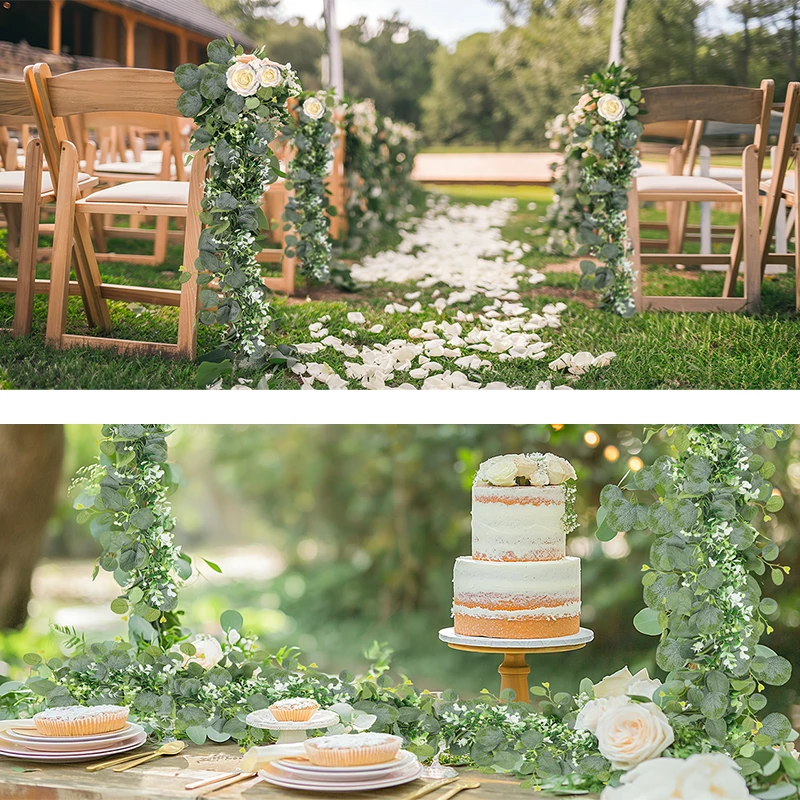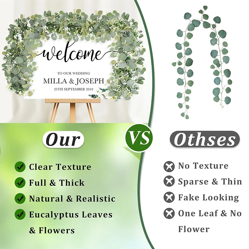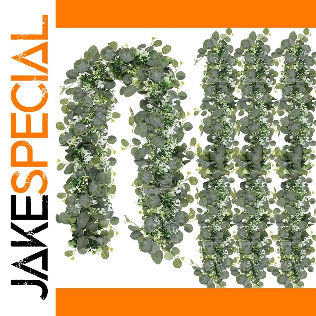 Transform your space effortlessly with this set of four artificial eucalyptus leaf garlands, each approximately 6 feet (1.8 meters) long. Crafted from high-quality silk leaves and durable plastic stems, these realistic, textured garlands feature lush, vibrant green foliage with intricate detail, including subtle veining and small white flower clusters for added elegance. They are maintenance-free, resisting wilting, fading, and damage, with flexible, detachable components that can be easily shaped and customized. Perfect for indoor and outdoor decoration, they’re ideal for enhancing tables, mantles, weddings, parties, gardens, swings, and windowsills, providing a long-lasting, beautiful natural touch to any setting.