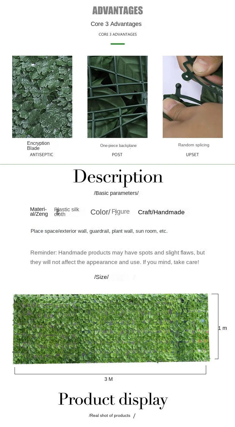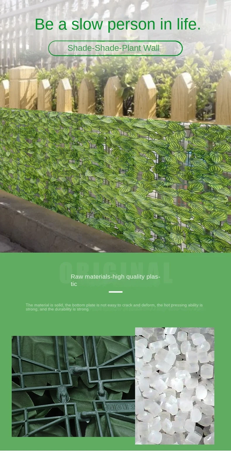 Transform your outdoor space with this 50x200cm artificial ivy hedge fence panel, featuring dense, realistic green leaves with detailed veins, serrated edges, and vibrant shading for a lifelike appearance. Made from lightweight, durable polypropylene, it is chemical-free and ideal for privacy screening, garden decoration, or balcony enhancement. The sturdy green plastic grid provides easy hanging and structural support, ensuring complete coverage and a natural, lush aesthetic. Available in various color options including green fence, groundnut fence, and maple leaf fence, along with size variations of 100x100cm, 50x100cm, and 50x300cm, this panel delivers versatility and a vibrant, organic vibe to your outdoor decor.