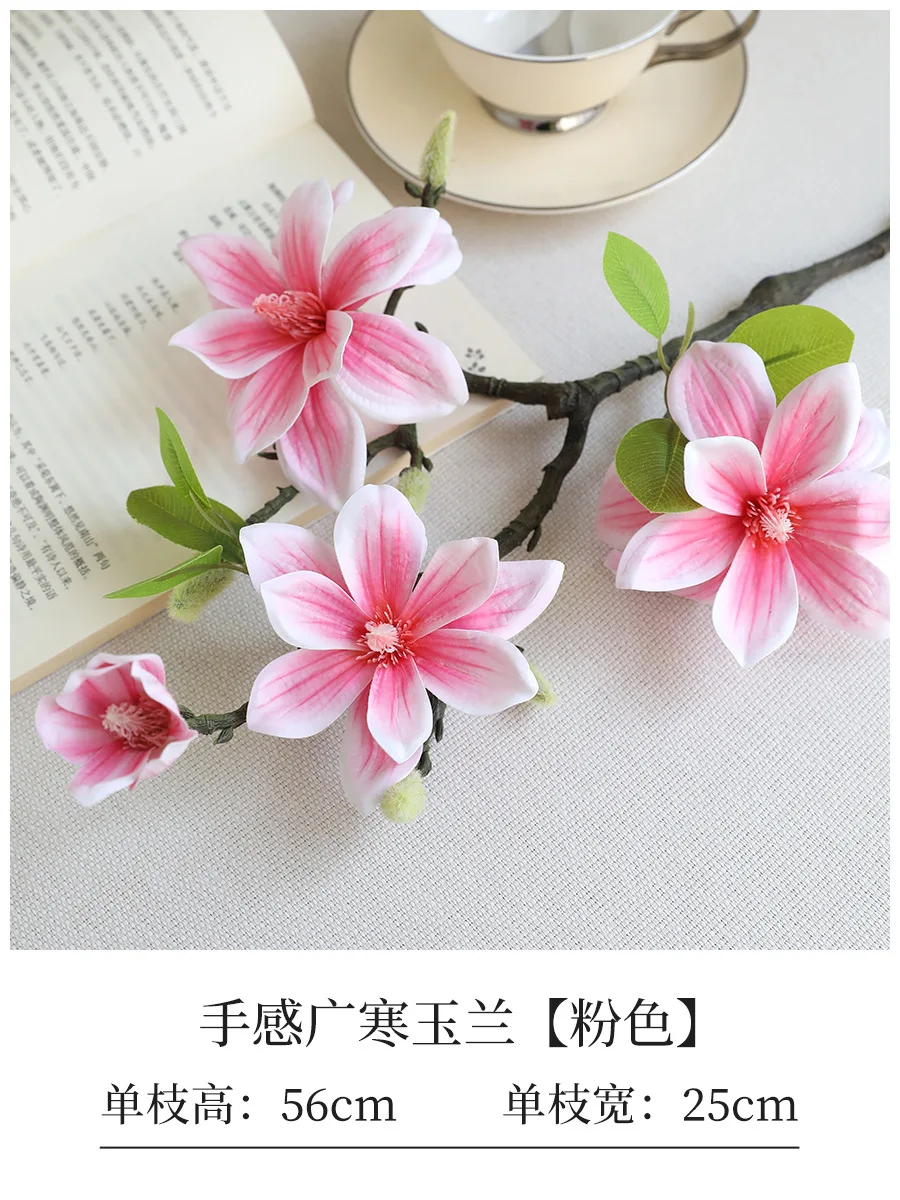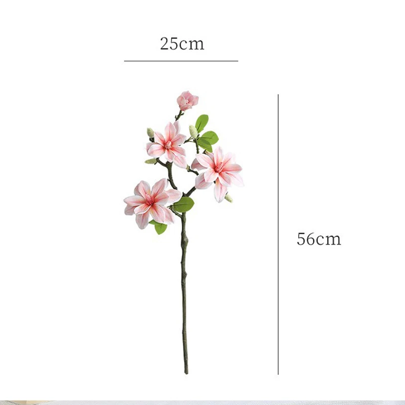 Bring a touch of elegance and natural beauty into your space with this this stunning artificial magnolia flower arrangement. Measuring 56 centimeters in length, it features delicately layered soft pink petals with white edges, fully bloomed to mimic the realism of real blossoms. The slender, dark brown branches with smooth green leaves add vibrancy and authenticity to the display. Crafted from durable cloth and plastic, these faux flowers maintain their vibrant appearance over time without wilting. The arrangement’s loose, natural style creates a relaxed yet sophisticated ambiance, perfect for elevating any interior decor. Whether for a wedding, birthday, or housewarming, this floral piece is designed to bring joy and elegance to your celebrations or everyday environment.