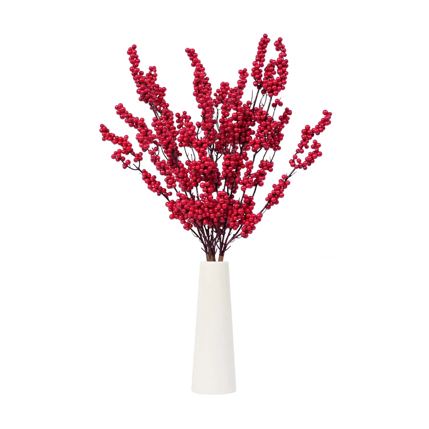 - The white cylindrical vase offers a minimalist and modern aesthetic, highlighting the vibrant red berries and complementing diverse holiday decor themes.