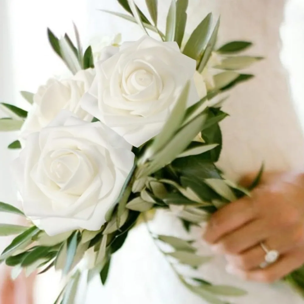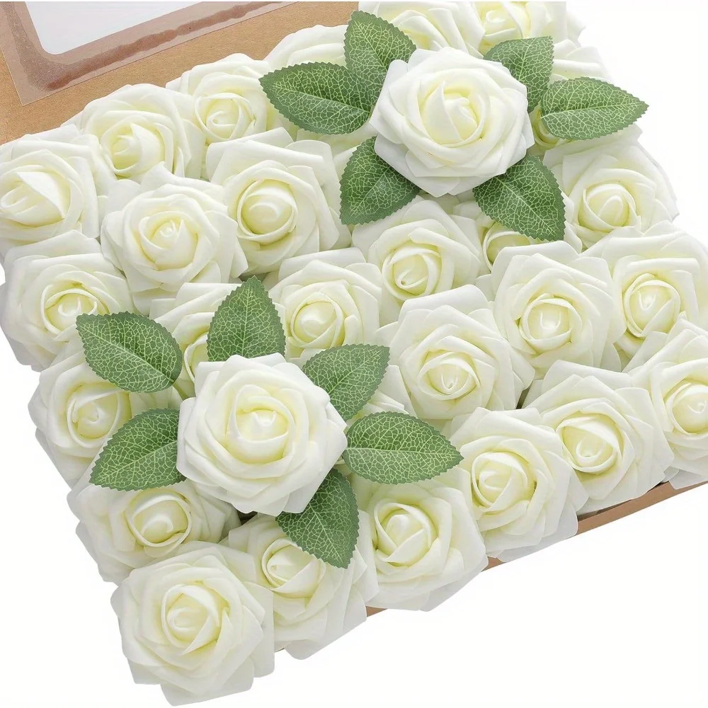 Transform your space with this stunning set of 32 artificial roses, featuring 30 beautifully crafted white roses and 2 detailed green leaves. Designed with a realistic finish, these foam roses showcase multi-layered, soft petals arranged in a natural spiral pattern, mimicking real roses perfectly. The dense, lush arrangement offers a classic, sophisticated look that elevates any interior decor. Ideal for weddings, birthdays, or intimate home gatherings, this set adds timeless elegance to your environment. Thanks to the genuine touch finish, you’ll enjoy their authentic feel and appearance. Their versatile design suits many occasions, creating an inviting ambiance in any room. Invest in this decorative piece for a refined, lasting floral display that captures the essence of real flowers.