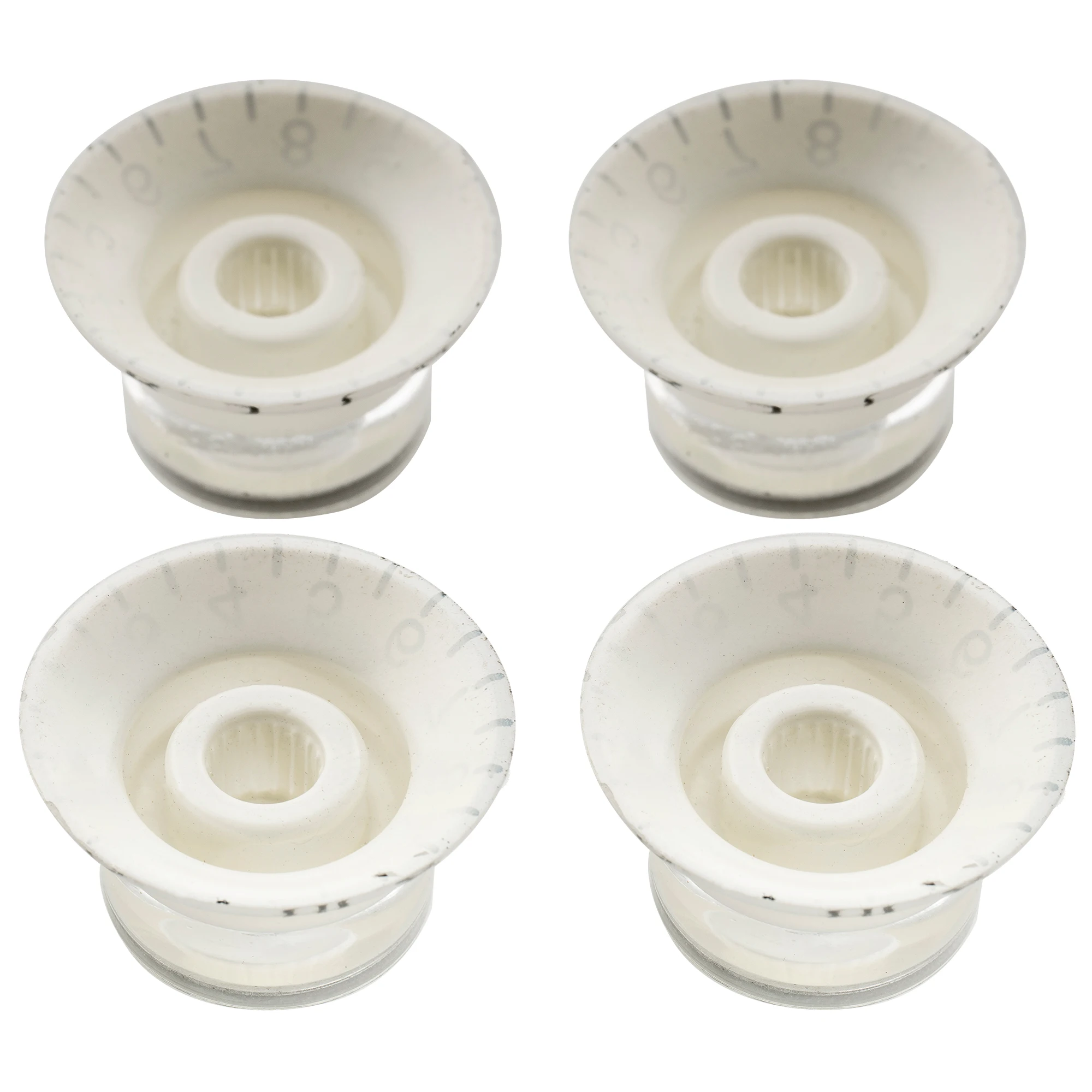 Transform your Asian-made electric guitar with this stylish set of four acrylic tone and volume control knobs. Designed specifically for post-2000 Epiphone LP, SG, and ES models, as well as most Japanese, Korean, and Indonesian Ibanez, ESP, and Cort guitars, these knobs combine modern aesthetics with precision engineering. Their sleek cylindrical shape tapers gently toward the top, featuring a durable acrylic body with an eye-catching metallic aluminum reflector on the top surface. The clear, reflective finish gives a contemporary feel, while the black numerical markings from 0 to 10 ensure intuitive control. Whether you want a subtle upgrade or a striking customization, these knobs will add both function and visual appeal to your guitar.