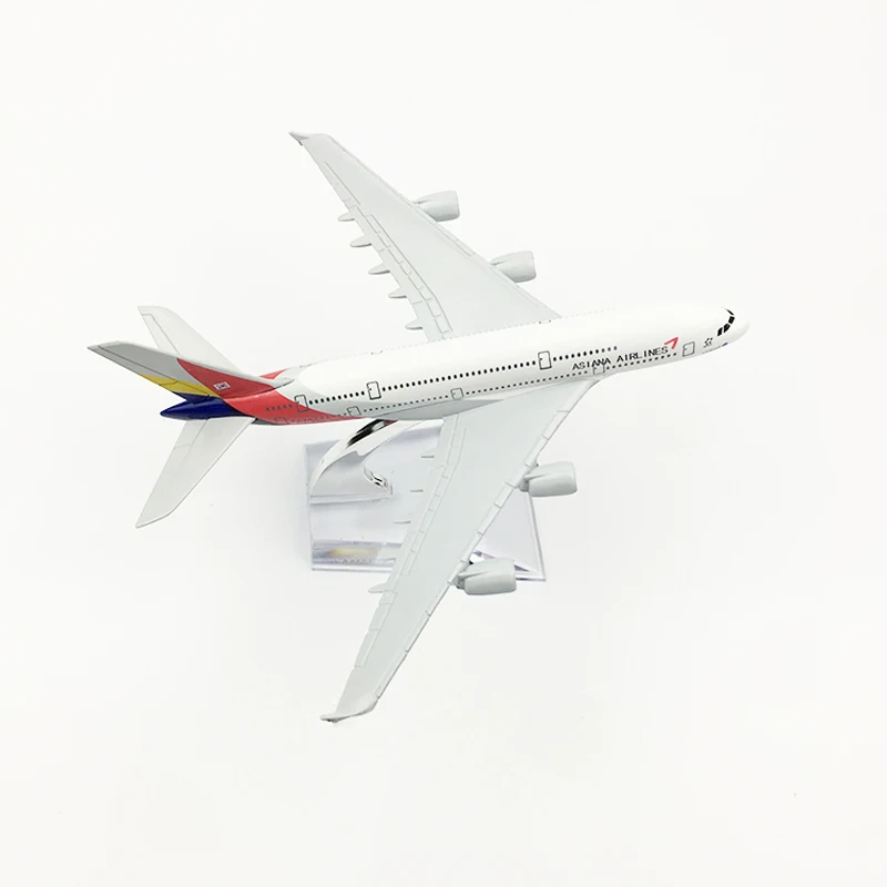 Imagine elevating your collection or display space with this exquisitely crafted model of the Airbus A380 in Asiana Airlines livery. Measuring approximately 16cm (6.30″) in length and 14cm (5.5″) across the wingspan, this diecast metal replica captures the aircraft's sleek design with remarkable precision. The shiny, smooth surface features a predominantly white fuselage decorated with intricate black markings, detailed windows, and text. The tail fin is vibrant with red, yellow, and blue accents, complemented by the South Korean flag’s subtle placement near the rear fuselage. Expertly molded engine nacelles and wing details emphasize realism. The model is mounted on a transparent plastic display stand, showcasing the aircraft in a slightly tilted flying posture, perfect for collection or home decor.