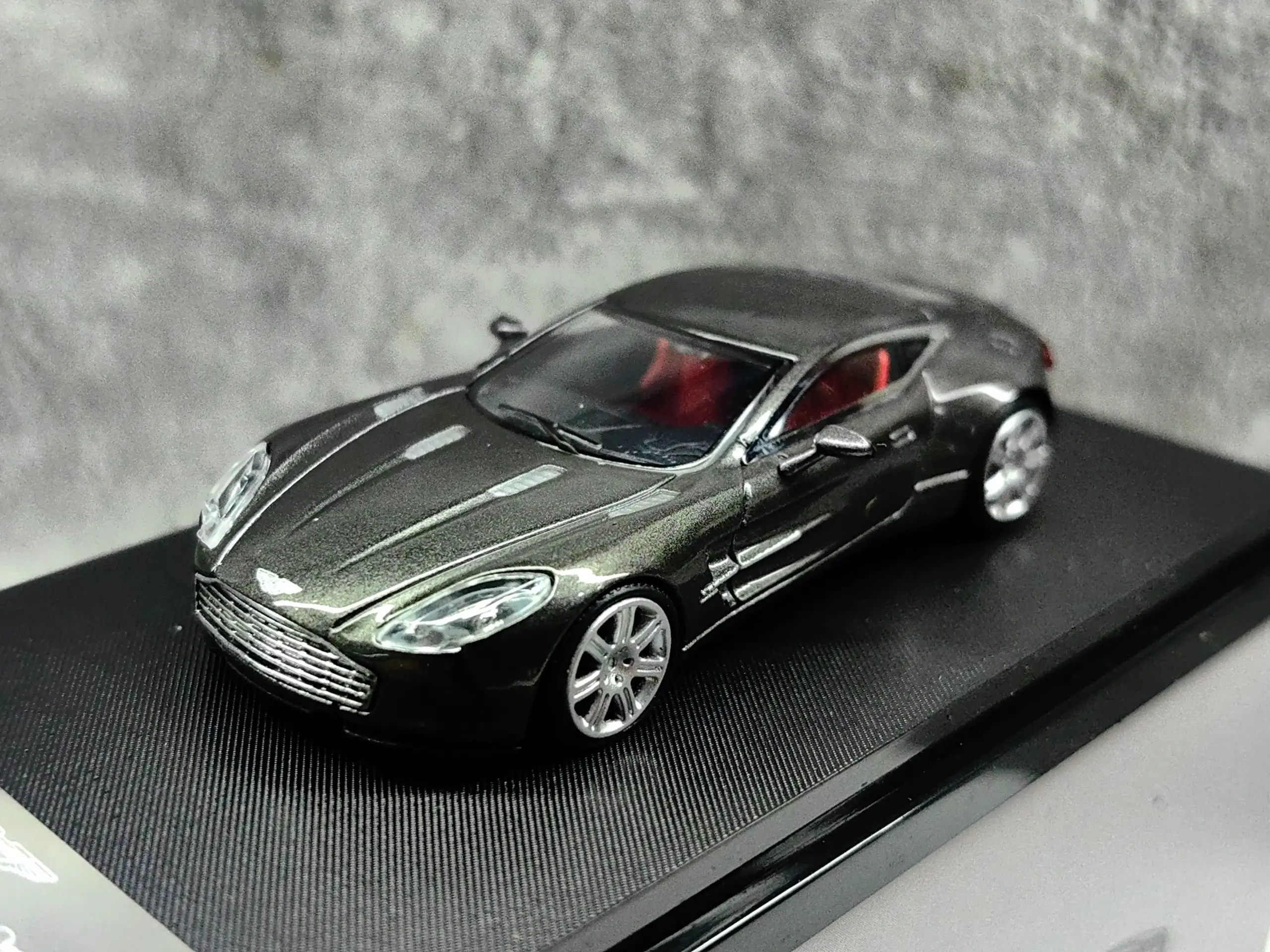 Step into the world of luxury and precision with this highly detailed diecast model of the Aston Martin ONE77, scaled at 1:64. Crafted from durable alloys and plastics, this static display ornament showcases the sleek, aerodynamic silhouette of the original supercar. Its exterior boasts a stunning metallic dark gray or gunmetal hue with a glossy finish, expertly reflecting light to emphasize flowing lines and sculpted details. The finely crafted front grille features narrow horizontal slats, while subtle vents and aerodynamic elements adorn the hood and sides. You can appreciate the transparent windows revealing a vivid red interior with detailed seats and dashboard. Perfectly suited for passionate collectors, this model exudes sophistication and craftsmanship, making it an impressive addition to any display collection.