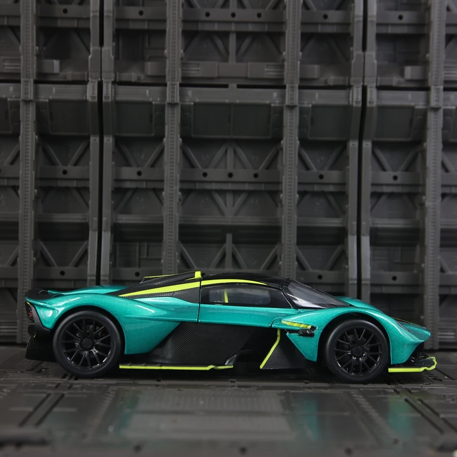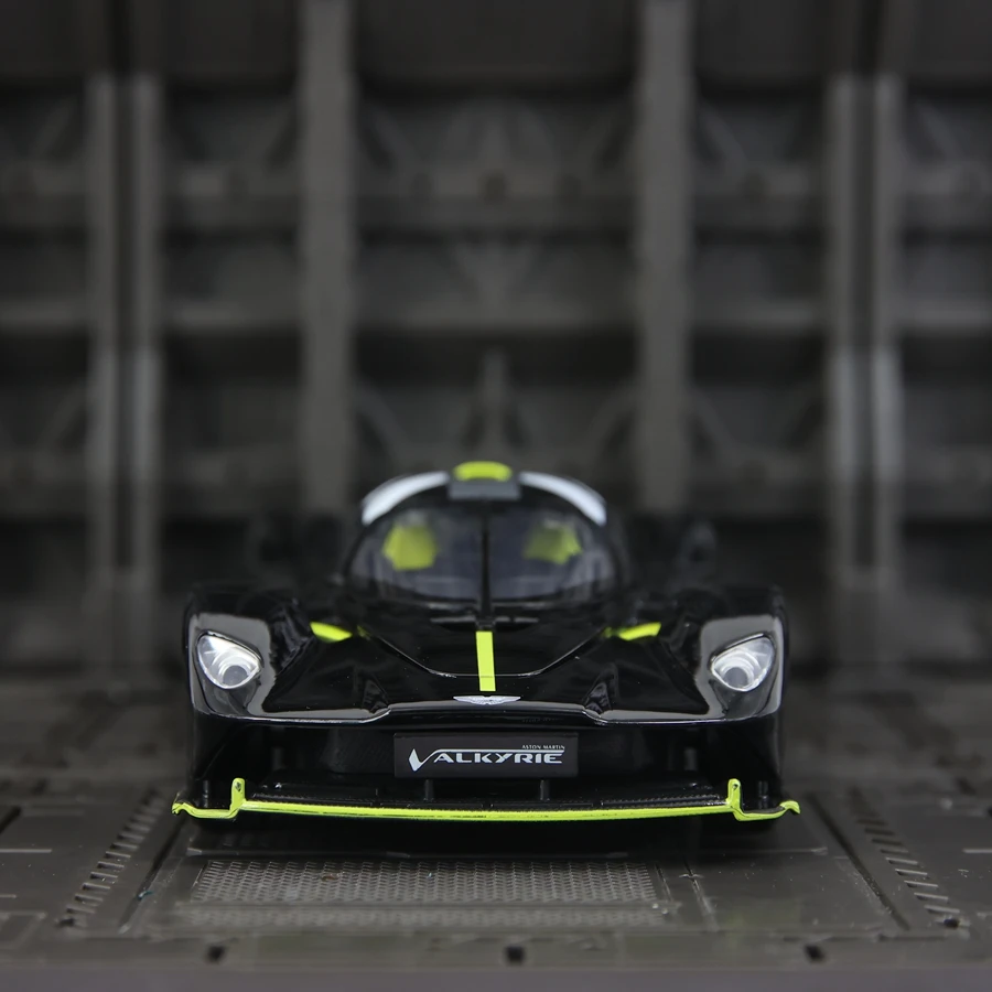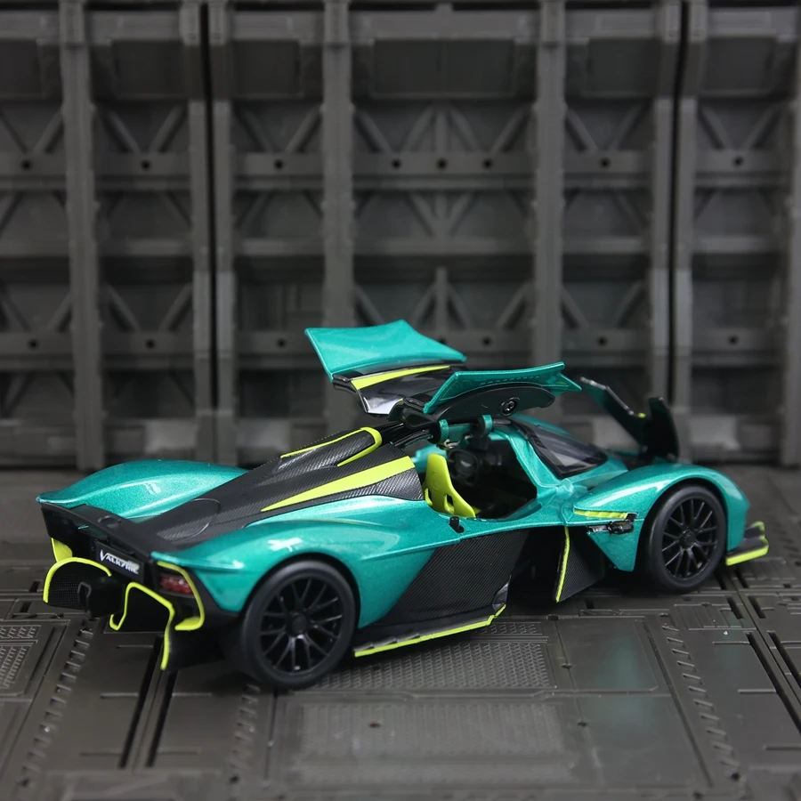 - This highly detailed diecast metal model is scaled at 1:23, accurately reflecting the proportions and styling of the real Aston Martin Valkyrie, emphasizing its sporty and aerodynamic form.