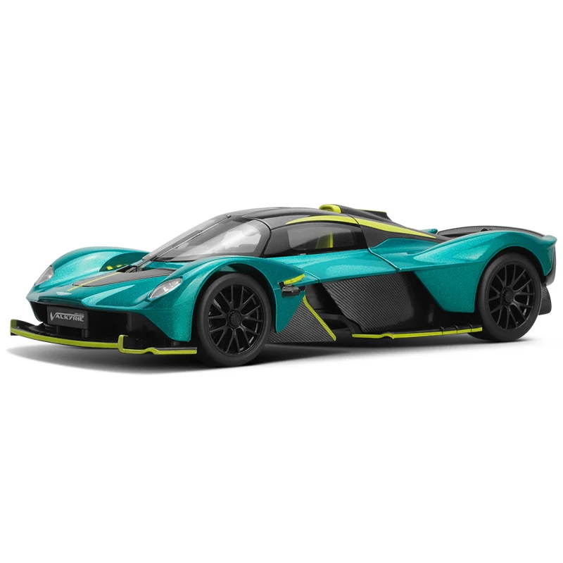 Imagine adding a striking touch to your collection or workspace with this meticulously crafted diecast model of the Aston Martin Valkyrie. Designed at a 1:23 scale, it captures the car’s sleek, aerodynamic silhouette with smooth, flowing curves that evoke speed and agility. The vibrant teal green body, complemented by subtle black accents on air intakes and vents, highlights the car’s modern, high-performance aesthetic. The model features realistic, large black multi-spoke wheels and seamlessly integrated details like a pointed front nose, detailed headlights, and aerodynamic side mirrors. With its opening doors that mimic real steering and shock absorption, this model combines craftsmanship and function, bringing the thrill of the supercar into your space. A true collector’s piece that enhances any setting with its dynamic presence and exquisite details.
