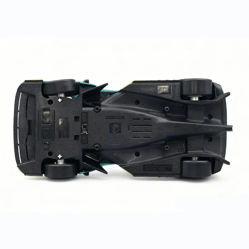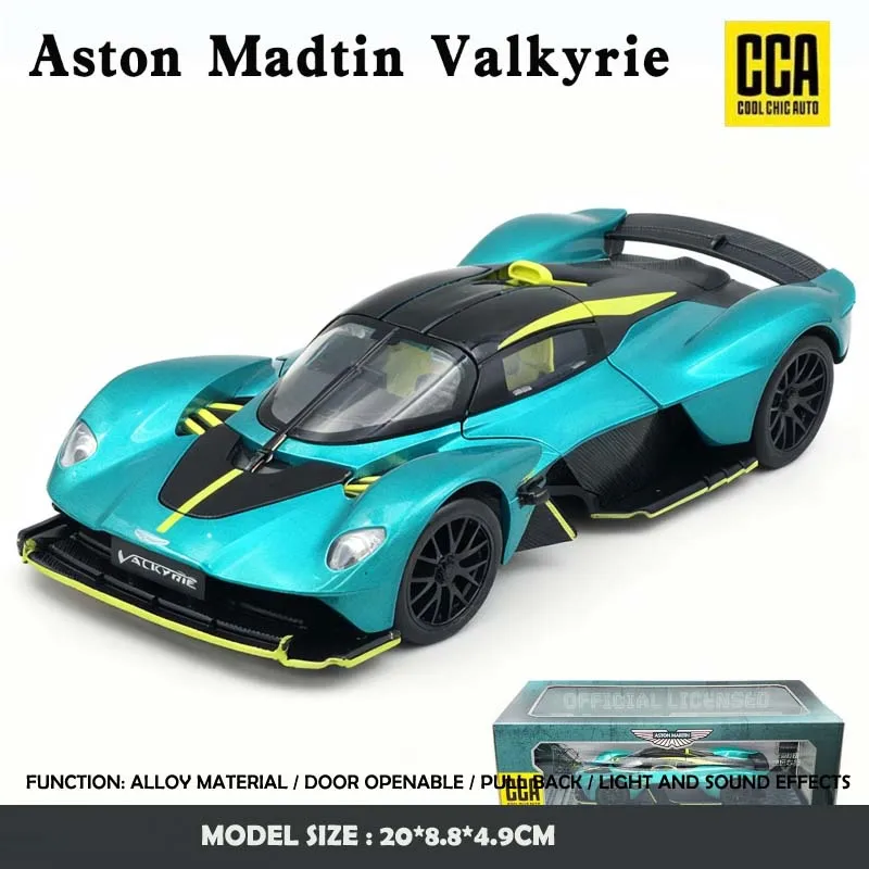 Experience the thrill of owning a highly detailed miniature of the Aston Martin Valkyrie with this exquisite diecast model. Crafted from durable metal alloy, it captures the sleek, aerodynamic design and racing spirit of the full-sized vehicle. The vibrant turquoise blue body contrasted with glossy black accents creates an eye-catching display piece that highlights every curve and line of this ultra-modern sports car. Yellow stripe accents on the hood, side mirrors, and rear wing add a dash of dynamism, making it a perfect collectible for enthusiasts or an elegant decorative addition to your home or office. Its sturdy construction ensures a weighty feel, giving you a realistic and premium experience as a proud owner of this detailed replica.