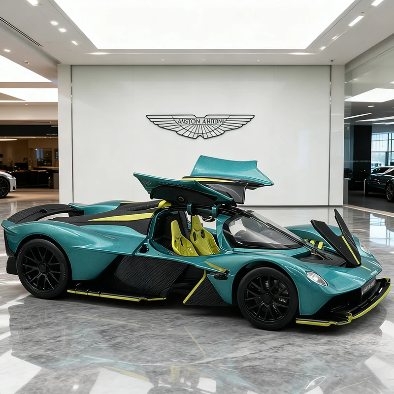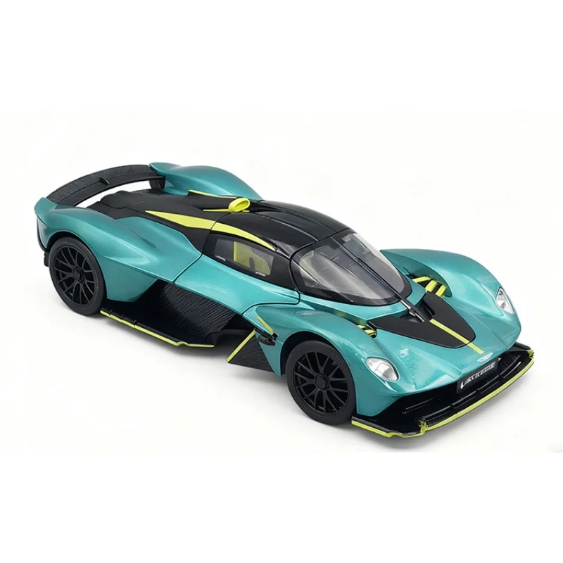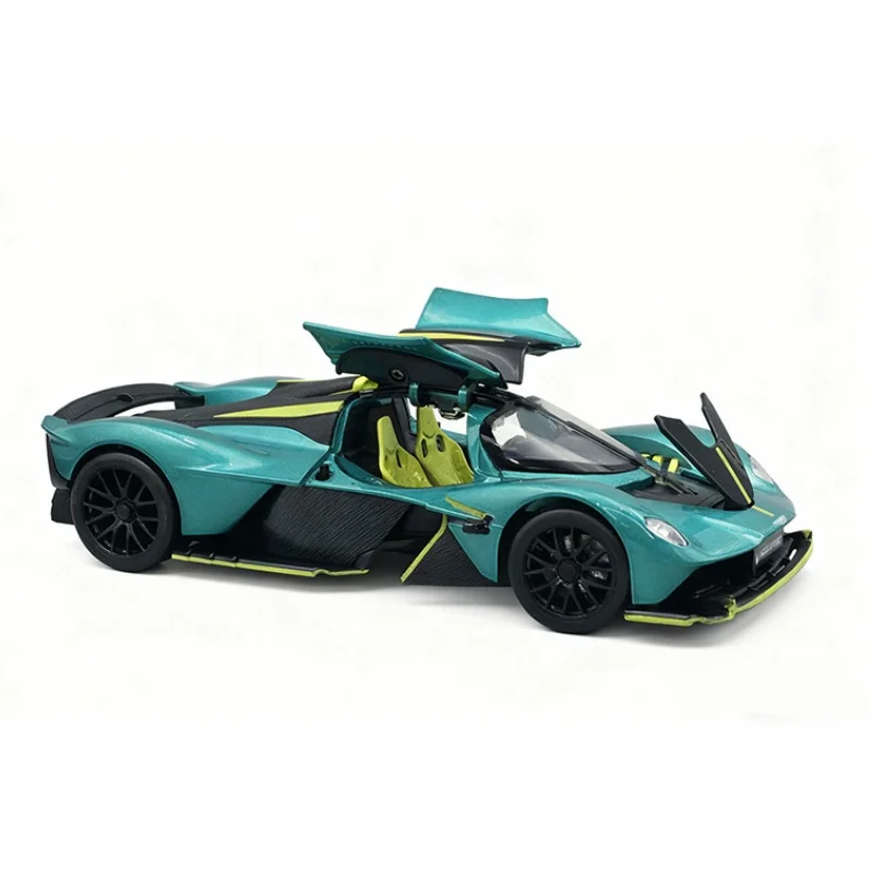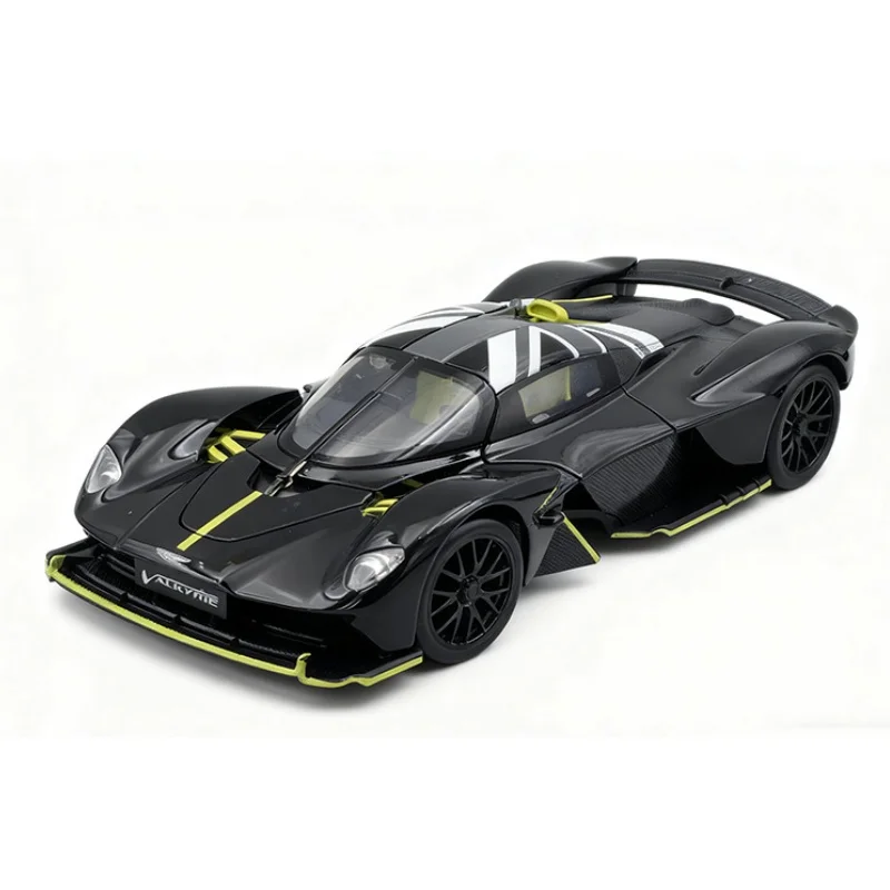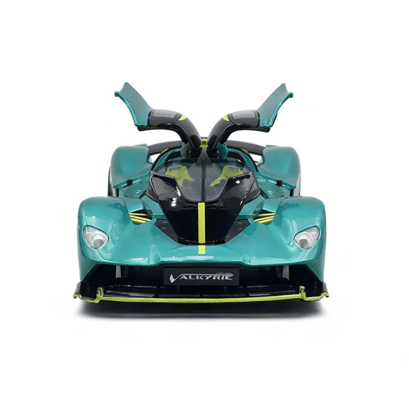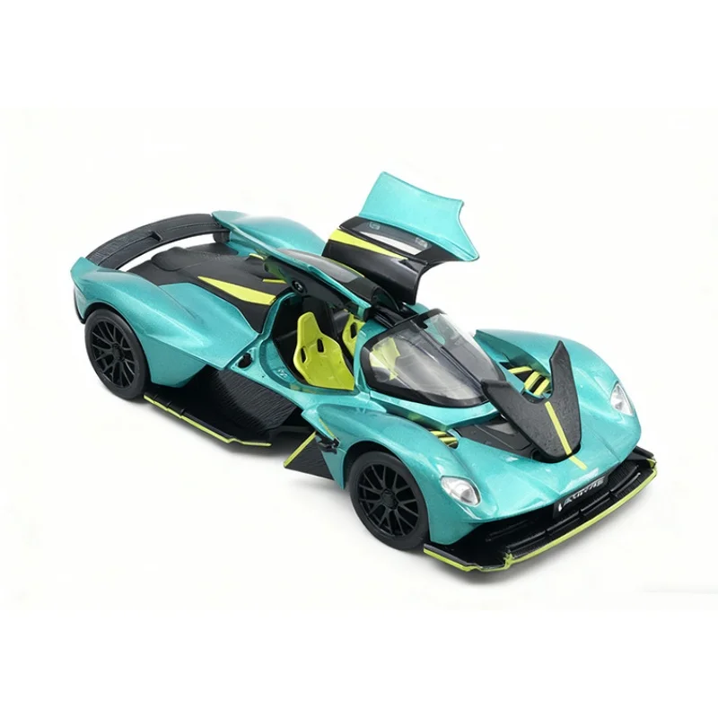 Immerse yourself in the sleek elegance of this highly detailed 1:24 scale diecast Aston Martin Valkyrie supercar replica. Crafted with a combination of alloy and plastic, its aerodynamic body features a stunning black or green finish, accented by vibrant yellow highlights on the front splitter, side skirts, and rear wing supports. The gullwing doors open upward to reveal an impressively detailed yellow interior that contrasts sharply with the exterior, emphasizing the sporty and futuristic design. The model includes sound and light functions, offering a dynamic display that enhances its realism. Perfect for enthusiasts and collectors, this high-quality replica embodies precision craftsmanship and modern aesthetics, making it an eye-catching addition to any collection or display space.