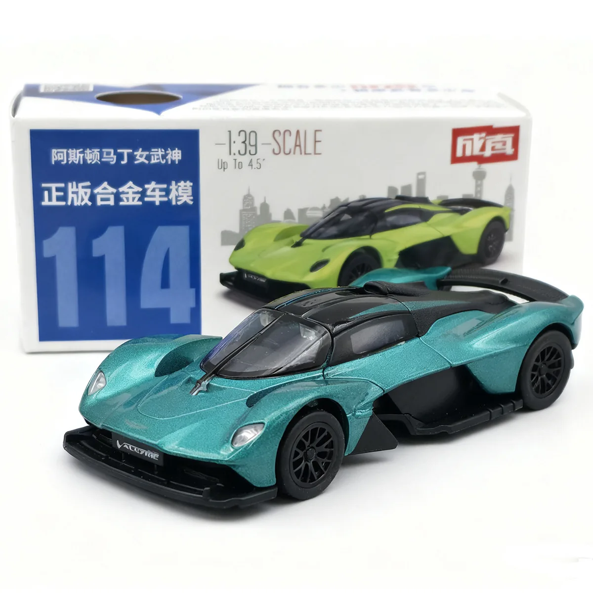 Experience the thrill of the Aston Martin Valkyrie with this intricately detailed 1:39 scale diecast alloy model, crafted from alloy and plastic without electronics or batteries. Its sleek aerodynamic design features a metallic teal finish, elongated hood, flush-mounted angular headlights, sculpted door panels, and a streamlined roofline for a modern, sporty appearance. Small side mirrors and detailed black rims add realism, making it a perfect collectible or display piece for enthusiasts aged 14+. This high-quality miniature captures the luxury, precision, and performance ethos of the iconic supercar, allowing you to own a stunning representation that exudes sophistication and speed.