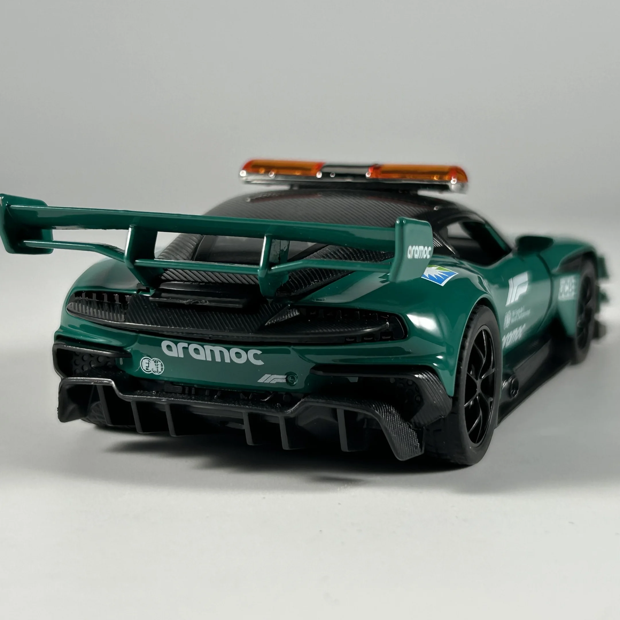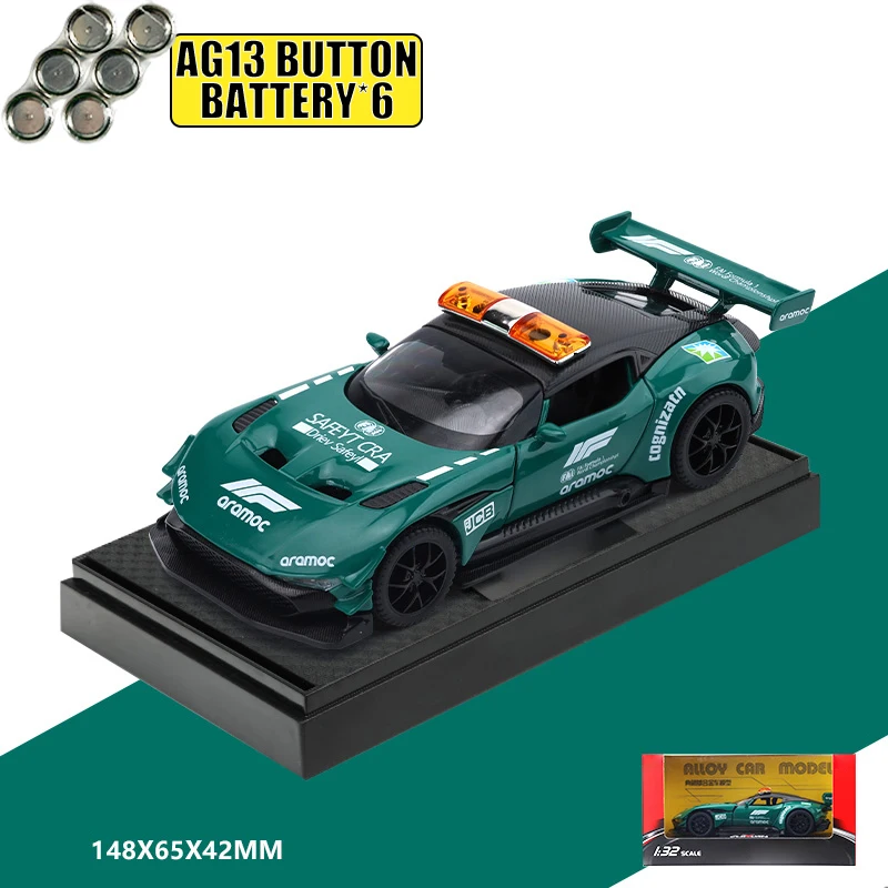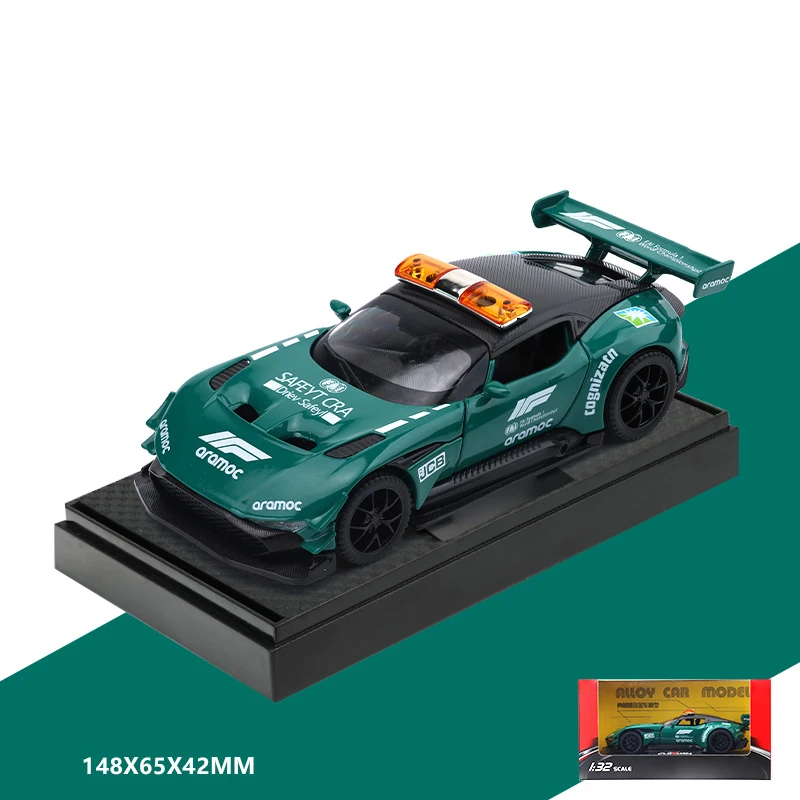 Experience the thrill of high-speed racing with this detailed 1:32 scale diecast model of the Aston Martin Vulcan Safety Car. Crafted from durable metal, this collectible showcases a sleek, aerodynamic silhouette with flowing curves and sharp racing lines. Its vibrant green paintwork is contrasted beautifully by white sponsor logos, racing stripes, and a striking orange and clear light bar on top, highlighting its emergency vehicle design. The black roof complements the multi-spoke rims and low-profile tires, emphasizing speed and agility. Meticulous attention to detail is evident in the honeycomb grille, angular headlights, small integrated side mirrors, and the rear spoiler, making it an eye-catching desktop ornament or display piece for car enthusiasts and collectors alike. Add this exclusive model to your collection today and bring the spirit of racing into your space.